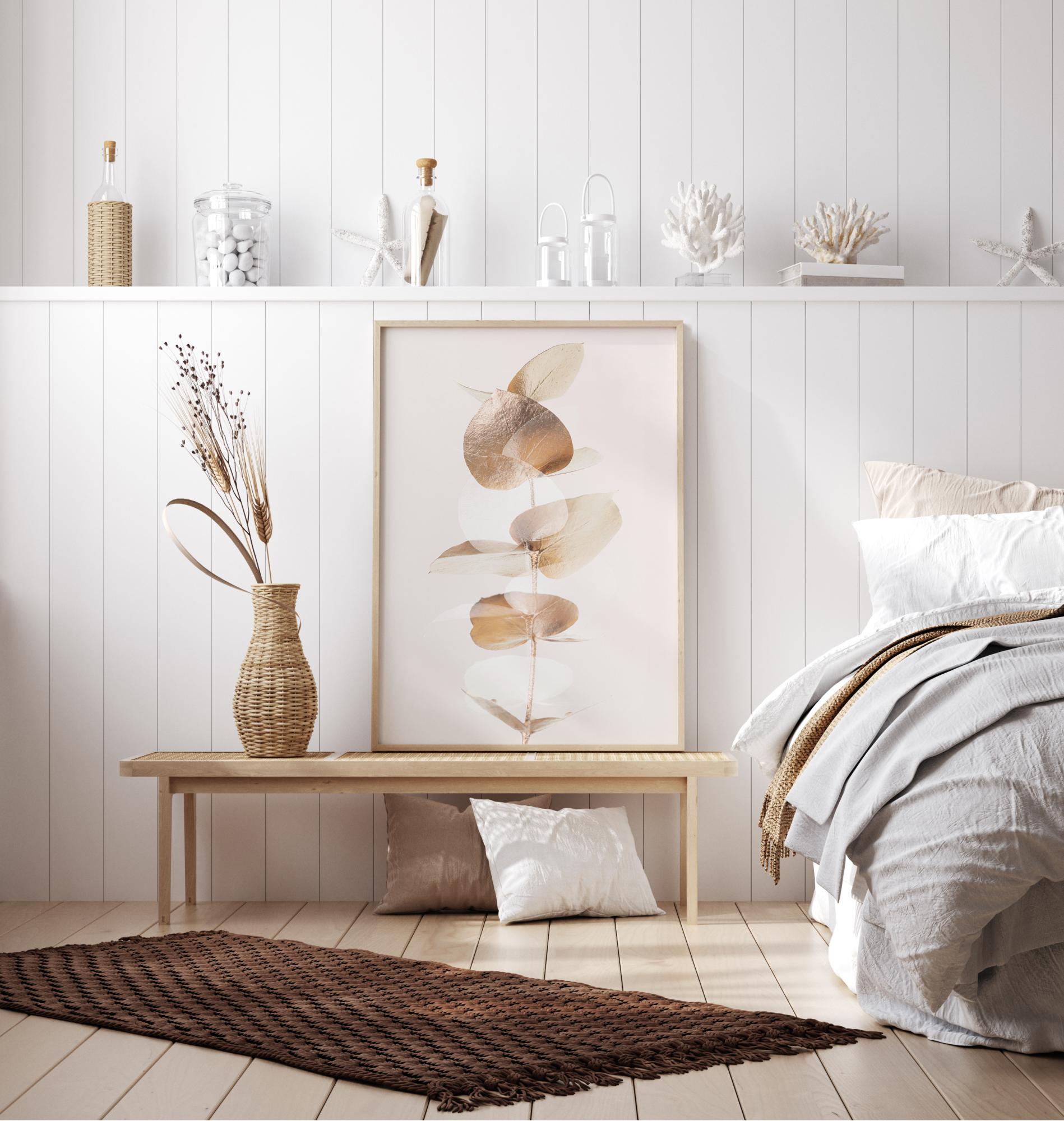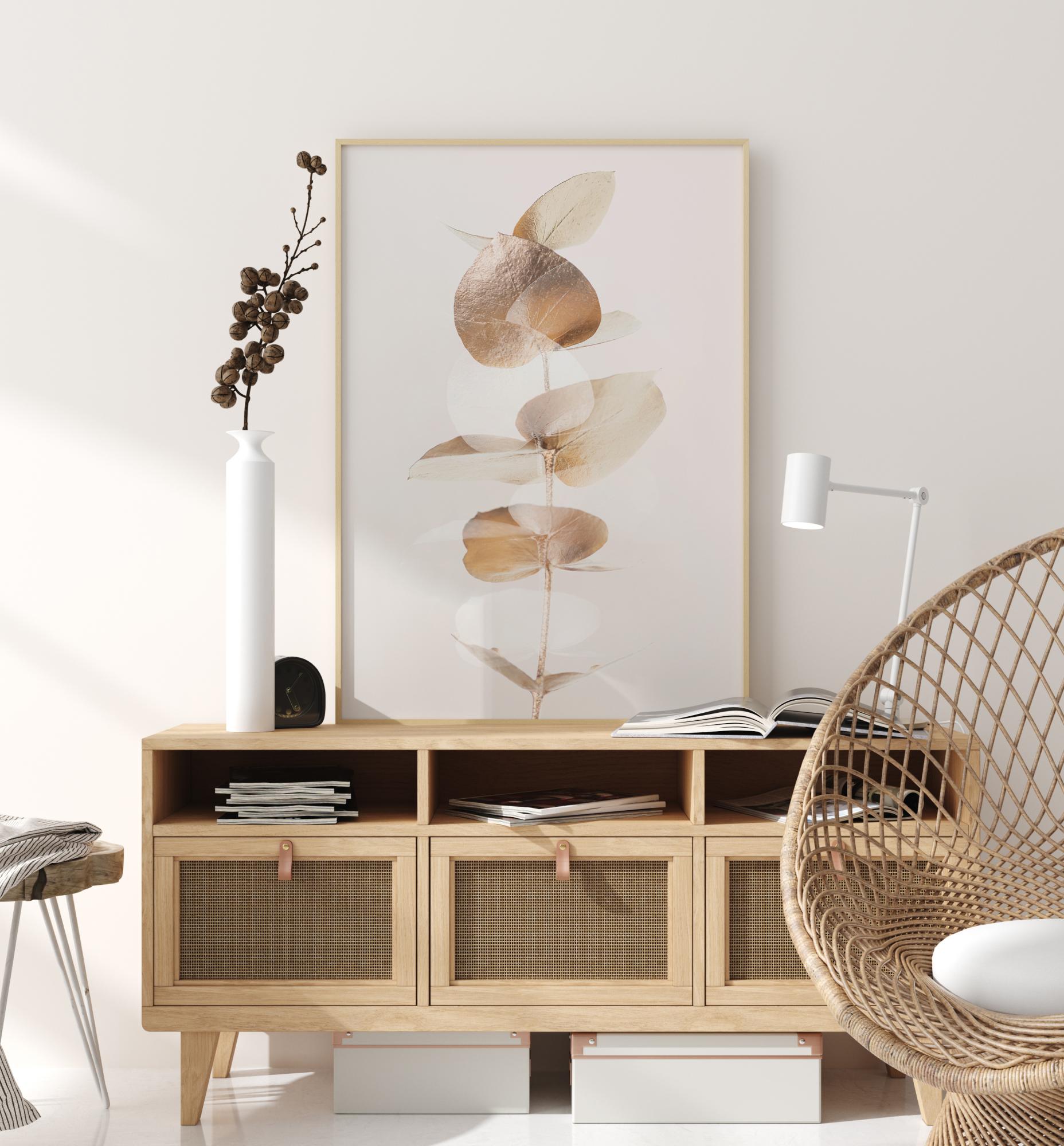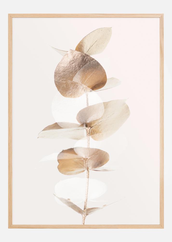 Pôstrový detail s niekoľkými zlatými eukalyptovými listami. Jednoduchá elegancia tohto obrázka je zvýraznená jednoduchým bielym pozadím. Zlaté listy jemne žiaria, keď vyplňujú plagát svojím jemným leskom, čím vytvárajú pocit pokoja v dome.