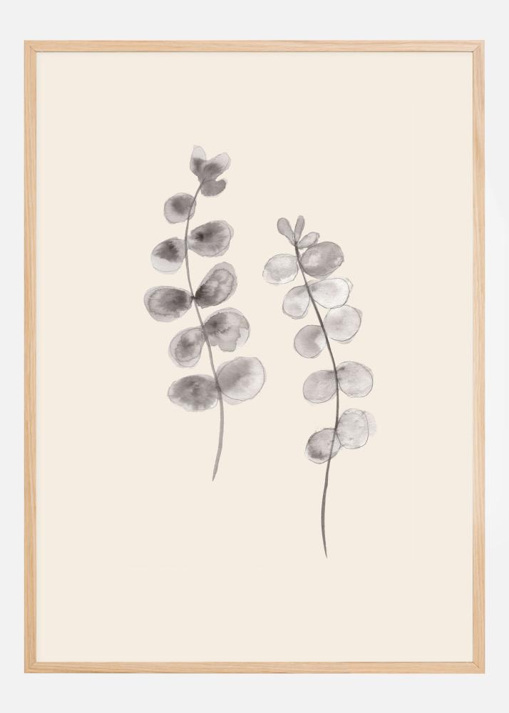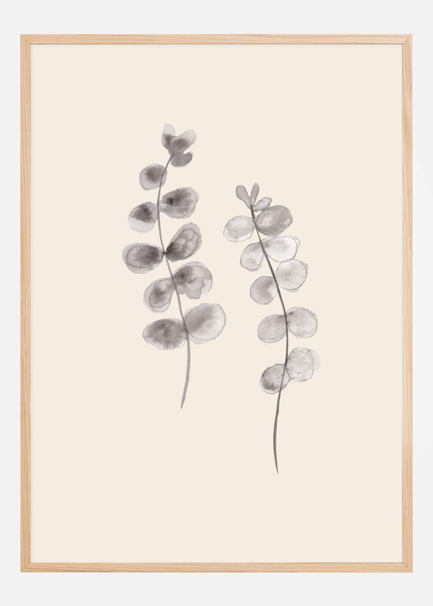 Botanický plagát s dvoma sivými vetvami s eukalyptovými listami. V strede bieleho pozadia sú dve sivé maľované vetvy s eukalyptovými listami. Ohýbajú sa spolu a vytvárajú mäkkú krivku, ktorá vedie pohľad nahor cez plagát. Zaveste tento listnatý tanec vo vašom dome pre upokojujúci pocit.