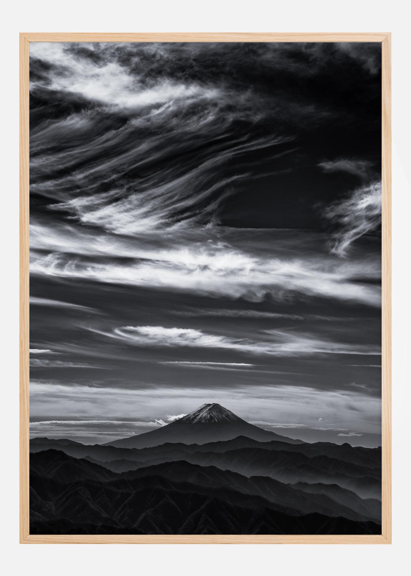 Tento plagát je veľkolepou čiernobielou reprezentáciou ikonickej hory Fuji, objímanej dramatickou hrou oblakov a vetrov na oblohe vyššie. Kontrast medzi tmavými, ryhovanými horskými hrebeňmi a jemnou oblohou poskytuje silný a dynamický vizuálny dojem, ktorý je zároveň nadčasový a očarujúci.
