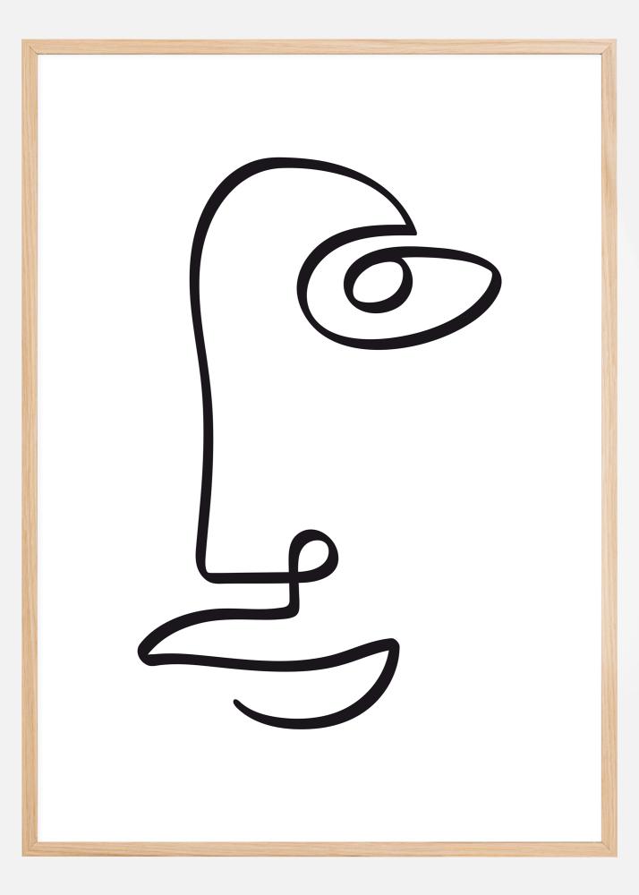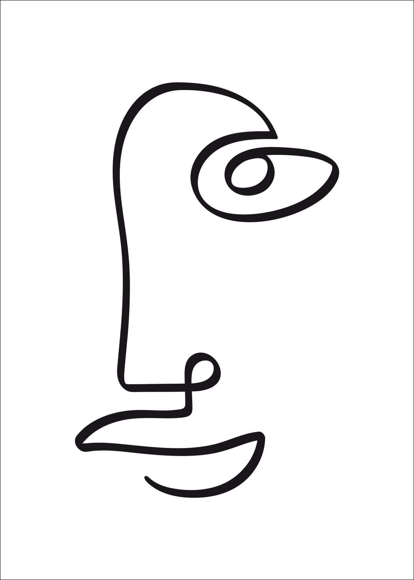 Abstraktný plagát s tvárou, nakreslený čiernou čiarou. Jednoduchá čierna čiara sa na obrázku krúti a vytvára jednu stranu tváre bez toho, aby jediný raz opustila papier. Uvažujte o tomto jednoduchom obraze, keď ho zavesíte doma, a snažte sa vidieť ďalšie figúry skryté v diele.