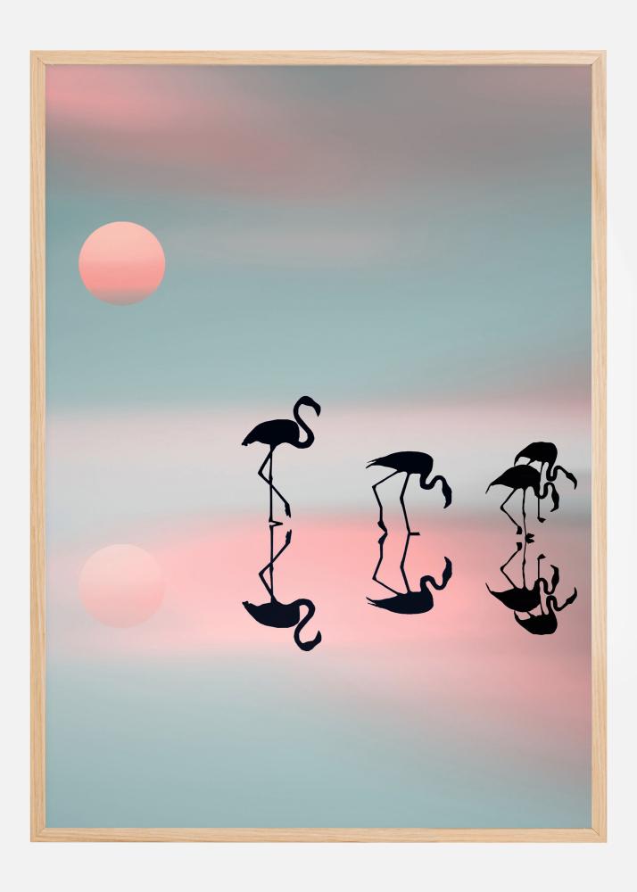 Živý plagát so štyrmi plameniakmi, ktoré sa kŕmia pri jazere s jemnými pastelovými farbami. Modré, ružové a broskyňové svetlo vytvára mäkký obraz so siluetou rodiny plameniakov jemne prechádzajúcich cez jazero. Skoro môžete cítiť pokoj v tomto mäkkom, jemnom obraze.