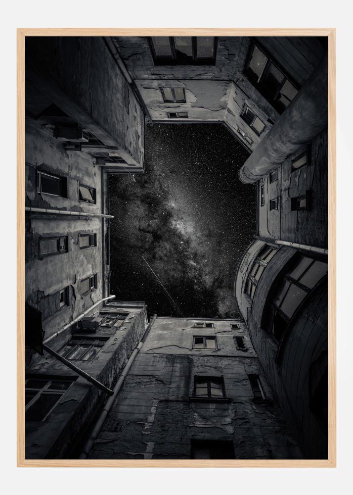 Táto fotografia ponúka jedinečný pohľad, ktorý zachytáva pohľad diváka smerom nahor pozdĺž starých fasád budov smerom k hviezdnej oblohe. Tmavé tóny a textúry budov poskytujú pocit histórie a plynutia času, zatiaľ čo hviezdy nad nimi pridávajú pocit večnosti a nekonečnosti.