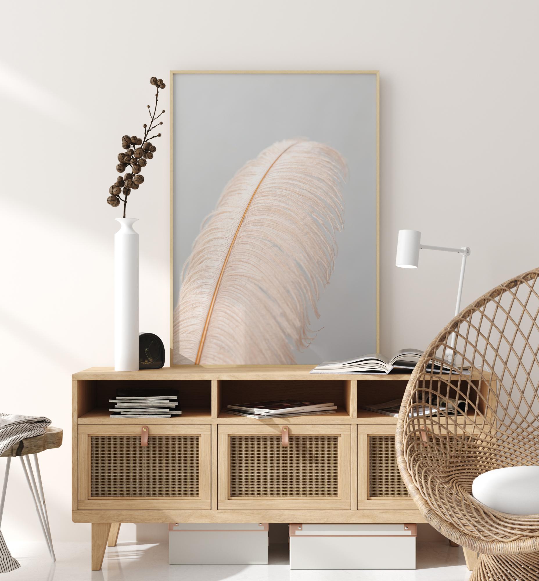 Detailný plagát s veľkým pštrosím perom. Mäkké biele lupeňové ostne prúdia na obidvoch stranách ružovej centrálnej časti pera. Pero je na pozadí holubičej modrej, čo dodáva tomuto obrázku trochu rozprávkový pocit. Je to perfektný doplnok do detskej izby.