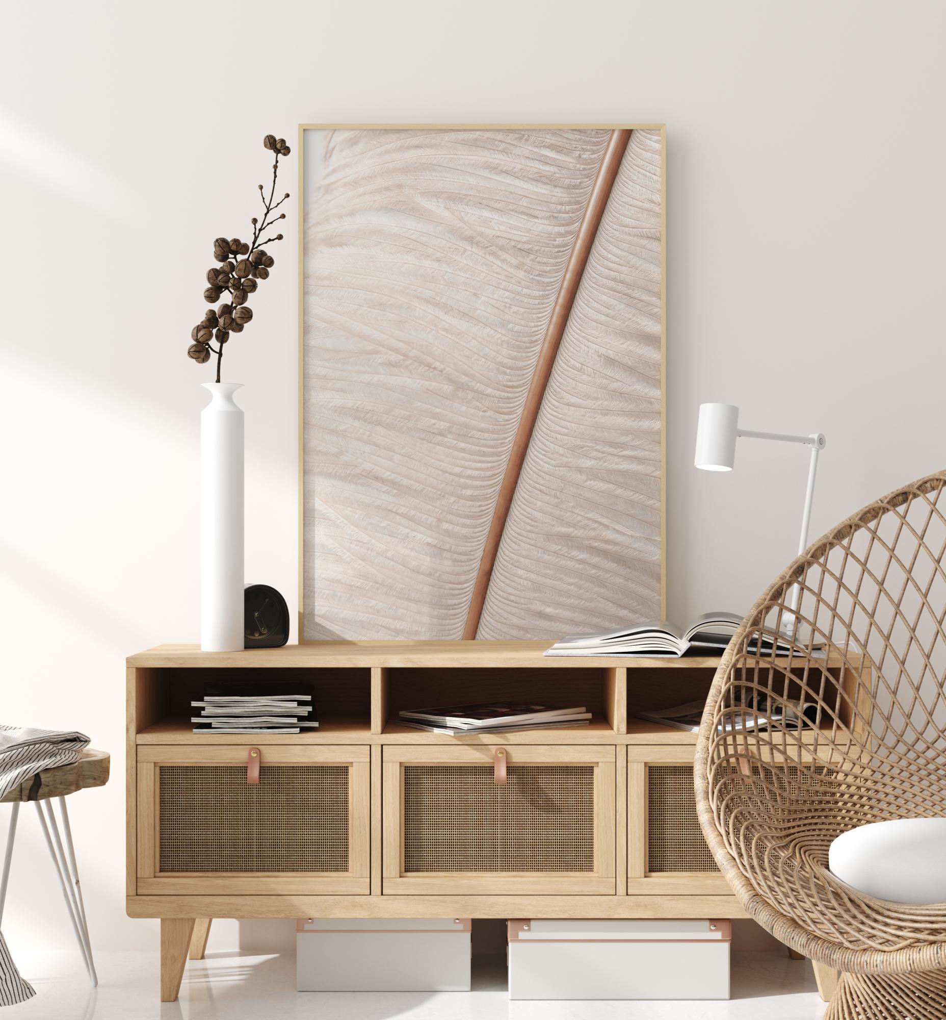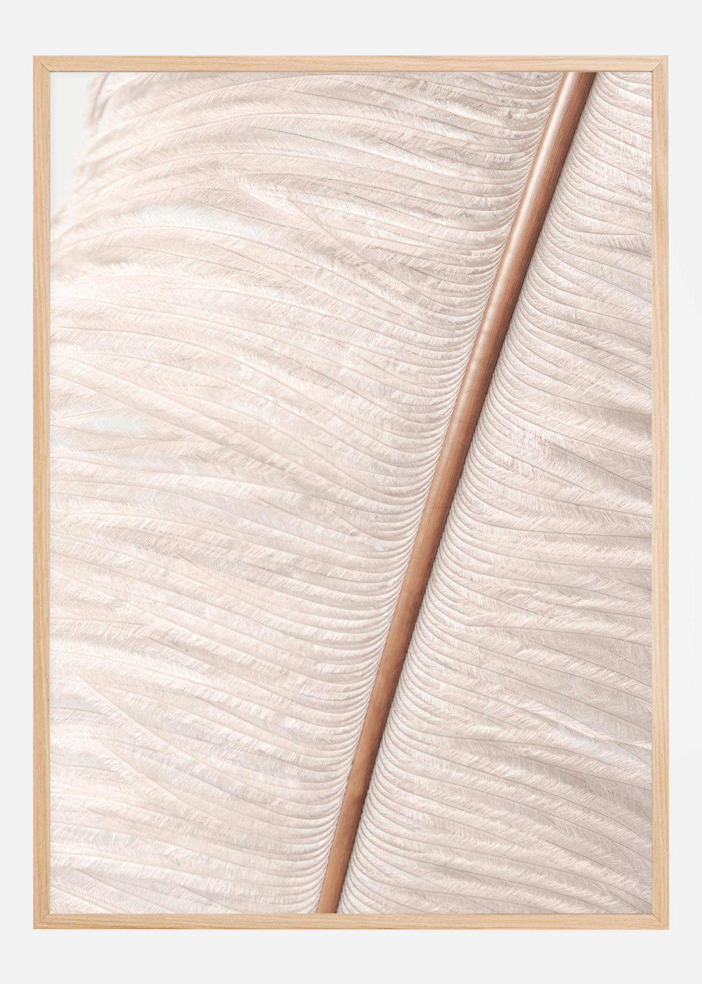 Makroposter s hlavnou osou pštrosej perá. Tento priblížený obrázok zobrazuje silnú centrálnu os so všetkými malými, nadýchanými bielymi vejárovými vláknami, ktoré sa rozvetvujú. Detaily sú ohromujúce na tomto mäkkom, ale napriek tomu pôsobivom plagáte. Skombinujte s neutrálnou stenou pre jemný efekt.