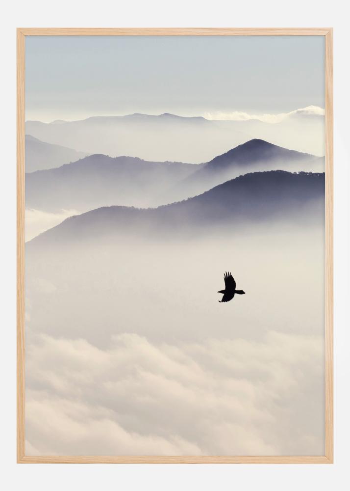 Tento prírodou inšpirovaný poster zachytáva jednoduchý, no predsa silný obraz slobody a ticha. Osamelý vták majestátne plachtí nad hmlistým údolím, s vrstvami hôr, ktoré sa postupne strácajú v jemnom svetle úsvitu alebo súmraku. Jemné tóny a minimalistická krajina vyvolávajú pocit pokoja a neobmedzenej slobody.