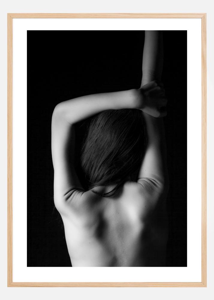 Portrétový plagát so zadnou stranou ženy. Tento čiernobiely obraz zvýrazňuje rovnomerné chrbtové svaly, zatiaľ čo jednu ruku zdvíha vysoko a druhú ohýba nad hlavu. Časti jej tela sú zahalené v tieni. Zaveste toto dielo doma, aby ste vytvorili trochu umelecký dojem.