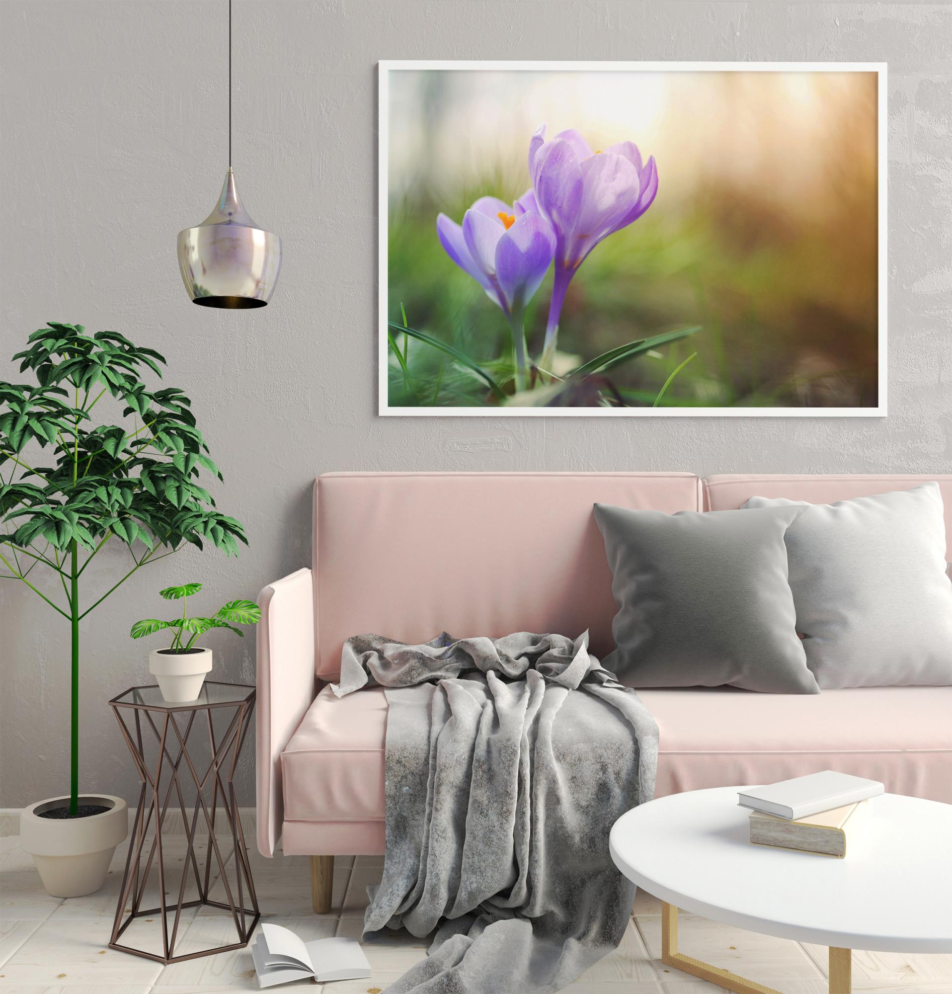 Očarujúci obraz možno najfarebnejšieho jarného milovníka slnka, šafranu. Rozmazané pozadie v komplementárnej farbe dodáva kvetom zdvih a fotografii harmóniu. Vhodné pre tých, ktorí chcú mať doma farebnú radosť a vždy je pekné použiť odtieň z obrazu ako akcentovú farbu v zvyšku interiéru. Skombinujte s inými rastlinnými motívmi, aby ste vytvorili pocit celistvosti v miestnosti.