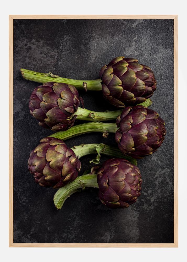 Tento rustikálny a prírodou inšpirovaný poster zobrazuje päť farebných artičokov na tmavom, textúrovanom pozadí. Detailná fotografia zvýrazňuje tmavozelené a purpurovočervené odtiene listov artičokov a zemitosť motívu by sa hodila do kuchyne alebo jedálne, kde môže inšpirovať k kulinárskym dobrodružstvám. Tento obraz nie je len poctou kráse prírody, ale aj pripomienkou schopnosti čerstvého jedla spájať ľudí.