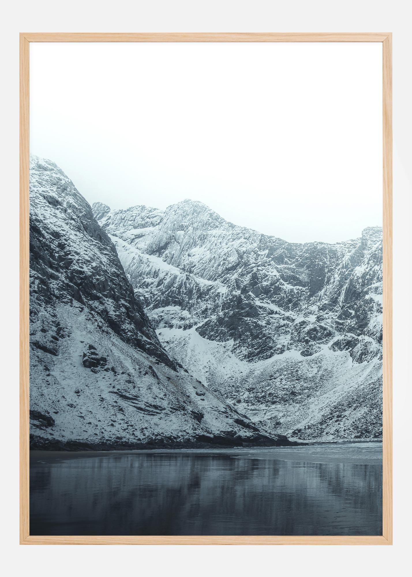Dramatický plagát s zasneženými horami, ktoré vedú dole k pokojnému vodnému povrchu. Jazero alebo možno fjord sa tiahne smerom k zasneženým horám a stretáva sa s nimi v popredí. Svetlá biela obloha pomáha vytvárať pocit zimy. Vneste chladné počasie dovnútra, keď zavesíte tento obraz.