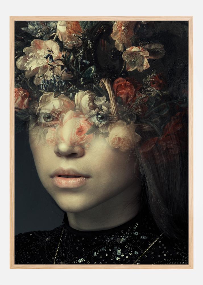 Tento očarujúci plagát spája krásu ľudského portrétu s nedotknutou estetikou prírody. Dielo zobrazuje ženu, ktorej tvár čiastočne zakrýva bohaté kvetinové usporiadanie, čo prináša tajomný a takmer snový efekt. Toto umelecké dielo so svojím kvitnúcim vencom a jemnou, naturalistickou farebnou paletou vyžaruje nadčasovú eleganciu a umeleckú finesu.