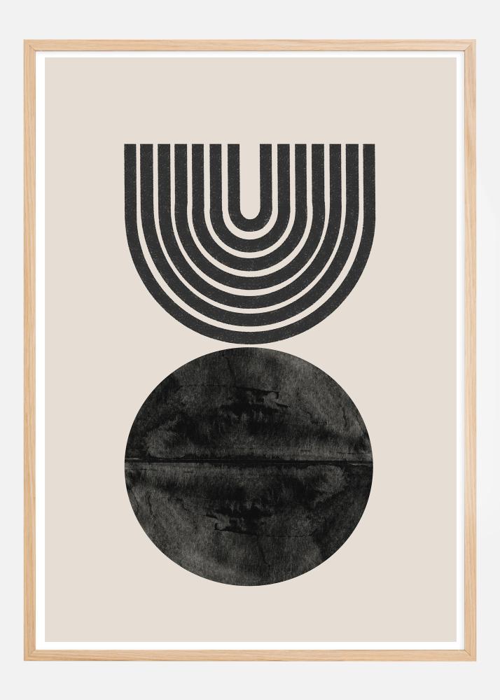 Táto umelecká plagát upúta pozornosť svojím odvážnym kontrastom a fascinujúcou kompozíciou geometrických a organických tvarov. Na vrchole je séria čiernych čiar, ktoré vytvárajú polkruhový tvar, čo poskytuje silnú vizuálnu štruktúru proti pokojnej, neutrálnej pozadie. Pod ním vidíme textúrovaný čierny kruh, ktorý pripomína odrazy vo vode, čím dizajnu pridáva hĺbku a tajomnú kvalitu. Vybrané farby v čiernej a krémovo-bielej vytvárajú nadčasovú paletu, ktorá oslovuje širokú škálu chutí a štýlov interiéru.