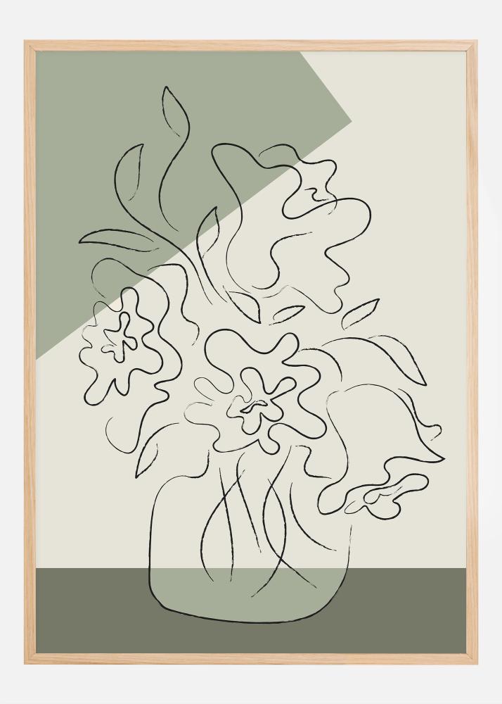 Tento umelecky abstraktný plagát zobrazuje štylizované okvetné lístky a listy v elegantnom, plynulom líniovom kreslení, ktoré pláva nad dvojfarebným pozadím jemných zelených a neutrálnych tónov. Jednoduchá krása dizajnu, zvýraznená jemnou textúrou, ktorá dodáva organický pocit, vytvára uvoľnenú a pokojnú atmosféru. Tento moderný a štýlový tlač by sa dokonale hodil do minimalistického alebo škandinávskeho inšpirovaného domova a priniesol by dotyk pokoja prírody bez toho, aby prekrýval miestnosť príliš veľa farbami alebo zložitosťou.