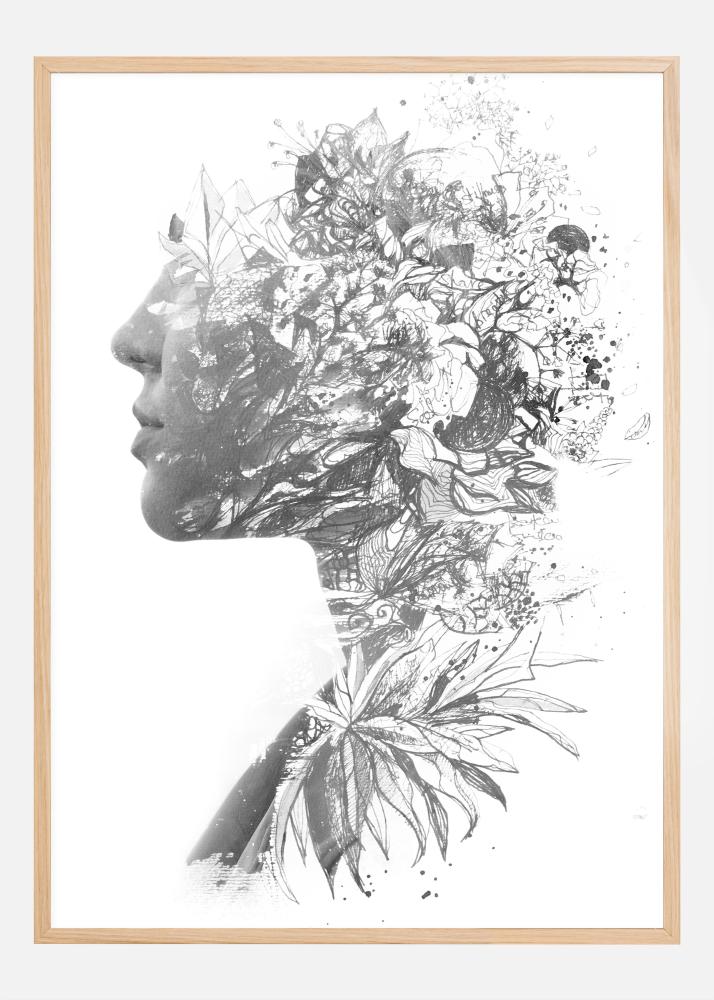 Tento umelecký plagát kombinuje profil ženy s detailnou a prepracovanou ilustráciou kvetov a rastlín, čo vytvára fascinujúcu fúziu ľudskej podoby a jemných detailov prírody. Čierno-biela farebná schéma dodáva nadčasový pocit a zvýrazňuje jemnú textúru a zložitosť či už ľudskej postavy alebo kvetinových motívov.