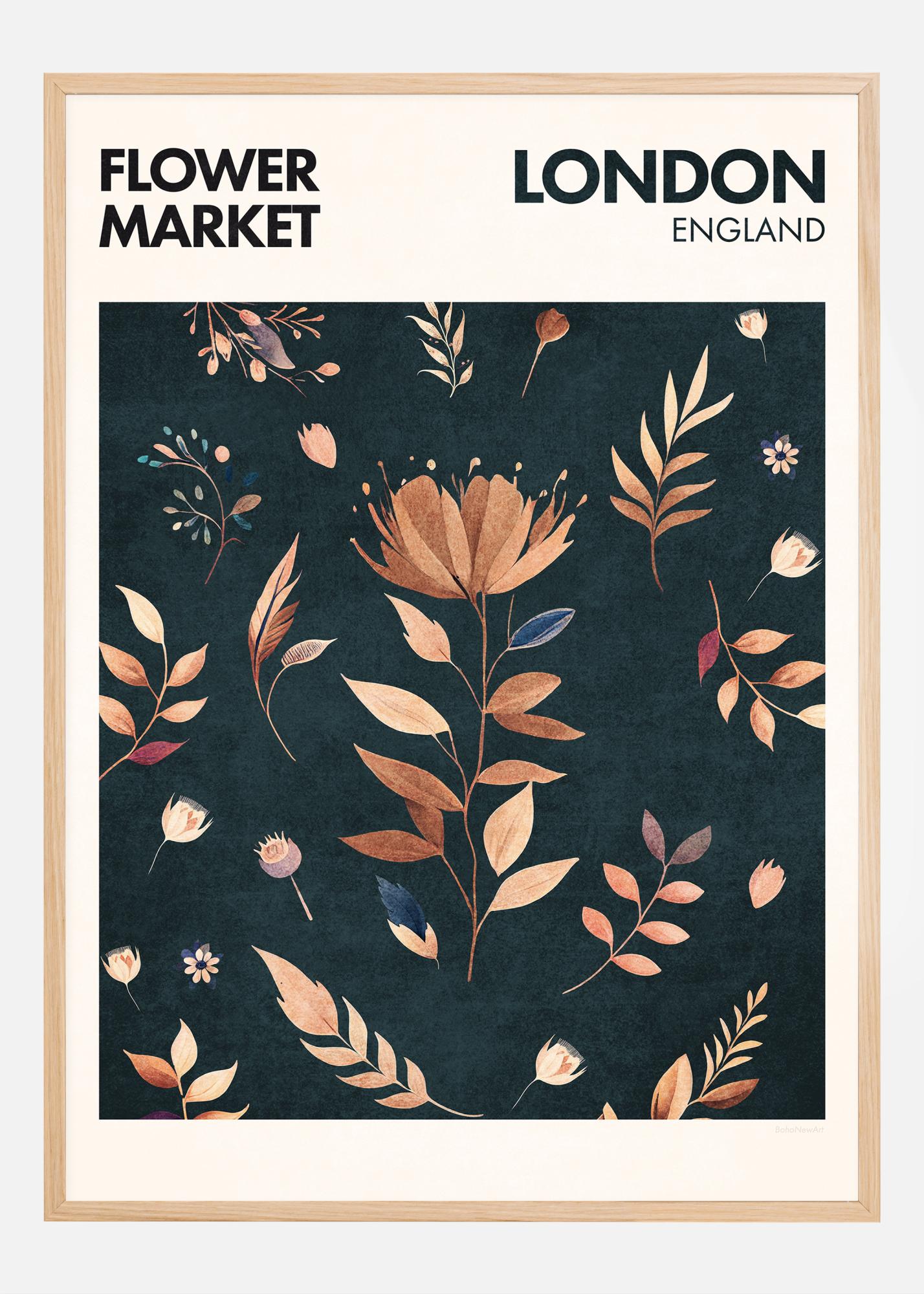 Táto očarujúca plagátová prezentácia zobrazuje eleganciu kvetov z londýnskeho slávneho kvetinového trhu. Farebná symfónia rastlinného života, ktorá kvitne v srdci Anglicka, je prezentovaná botanickou ilustráciou, ktorá zobrazuje zbierku kvetov a listov. Dizajn vyžaruje pocit klasického britského šarmu a nadčasovej krásy prírody.