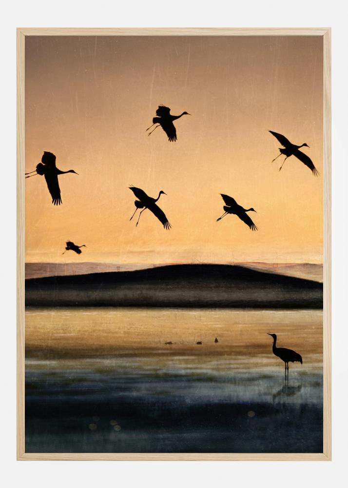 Náladový plagát s vtákmi letiacimi pri západe slnka. Šesť bocianov vzlietne, ich siluety ostro kontrastujú s oranžovou oblohou a zapadajúcim slnkom. Osamelý vták stojí v modro-zlatom jazere a pozerá sa na zvyšok, keď odlietajú. Pocíťte pokoj z lietania na tomto teplom plagáte.