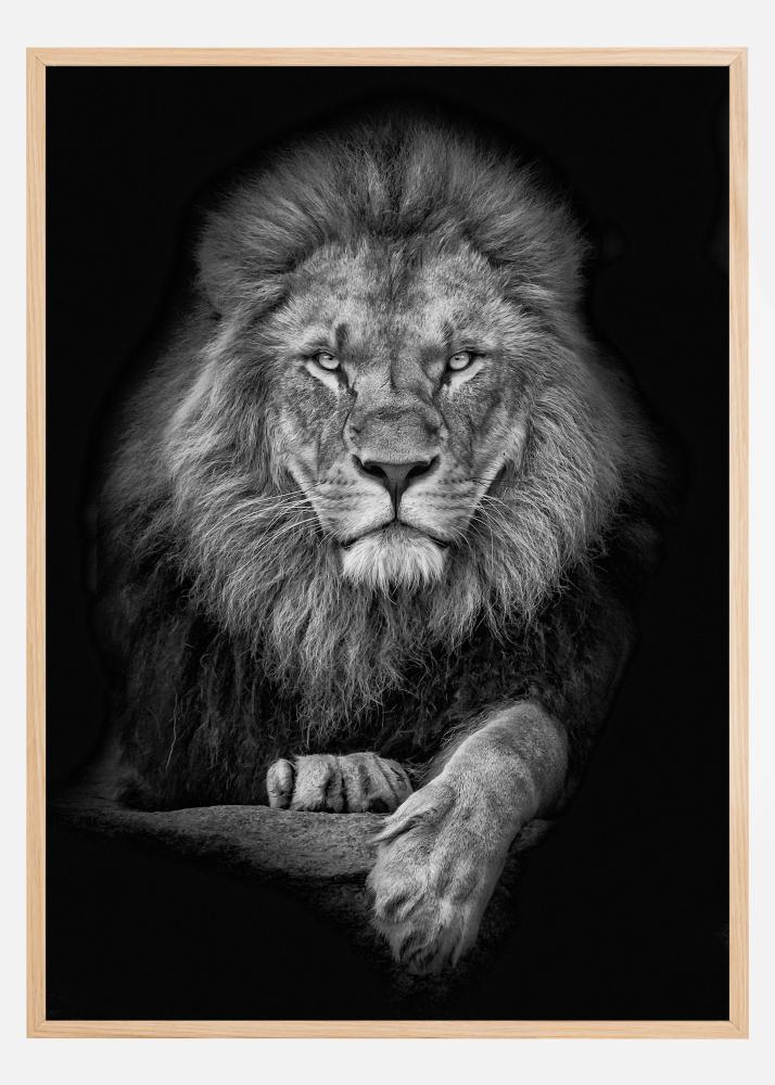 Čiernobiela detailná fotografia leva, ktorý sa pozerá priamo na diváka. Tmavé pozadie a intenzívny pohľad vytvárajú úžasný príťažlivý efekt na obraze. Toto je plagát, ktorý vyzerá rovnako dobre samostatne ako aj spolu s inými obľúbenými dielami vo väčšej koláži.