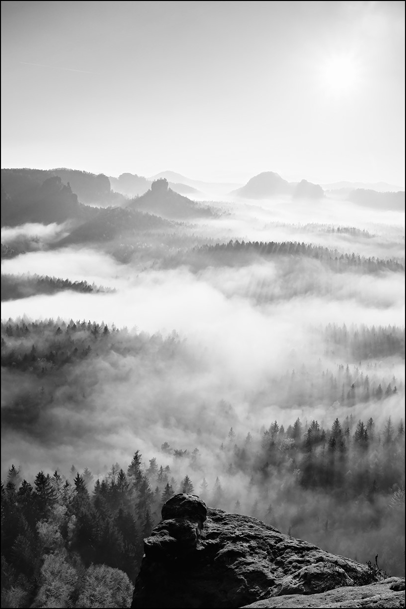 Čiernobiela fotografia s krajinkou zahalenou v hmle s horami pokrytými smrekmi ako motívom. Hlboká perspektíva na obrázku, s výhľadovým bodom vysoko nad stromami, dodáva plagátu dramatický pocit. Fotografia je rovnako vhodná na zavesenie doma ako aj vo verejnom prostredí, hodí sa do všetkých typov interiérových štýlov. Dopĺňte ju pekným fotorámom, ktorý zvýrazní motív a zladí sa s ostatným zariadením v miestnosti, kde má obraz visieť.