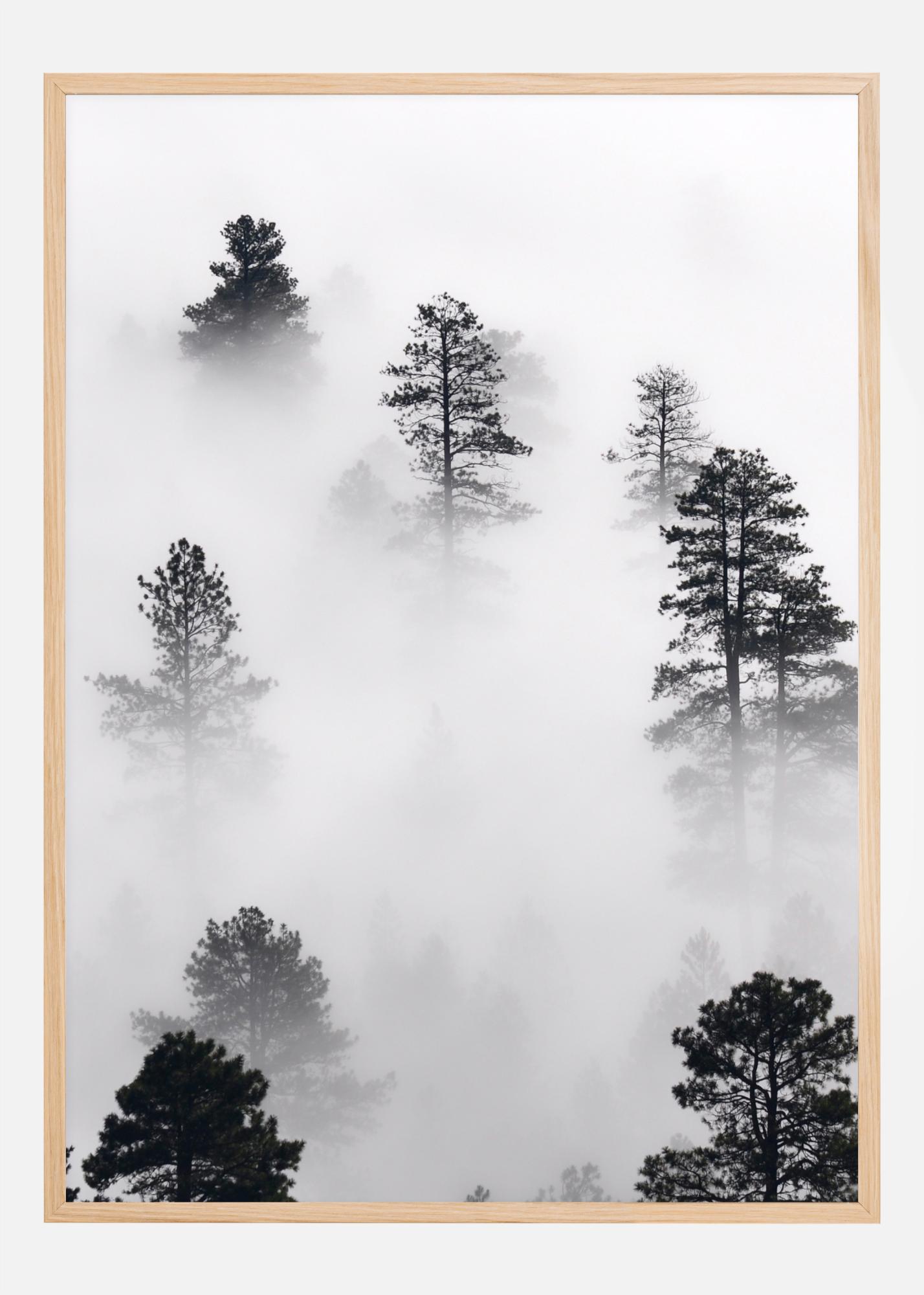Úžasný plagát s krajinou les v hmle. Vysoké tmavé koruny stromov sa vynárajú z bledého bieleho hmly a vytvárajú silný kontrast medzi hmlou a stromami. Prineste chladný zimný pocit do vášho domova, keď ho zavesíte na neutrálnu stenu.