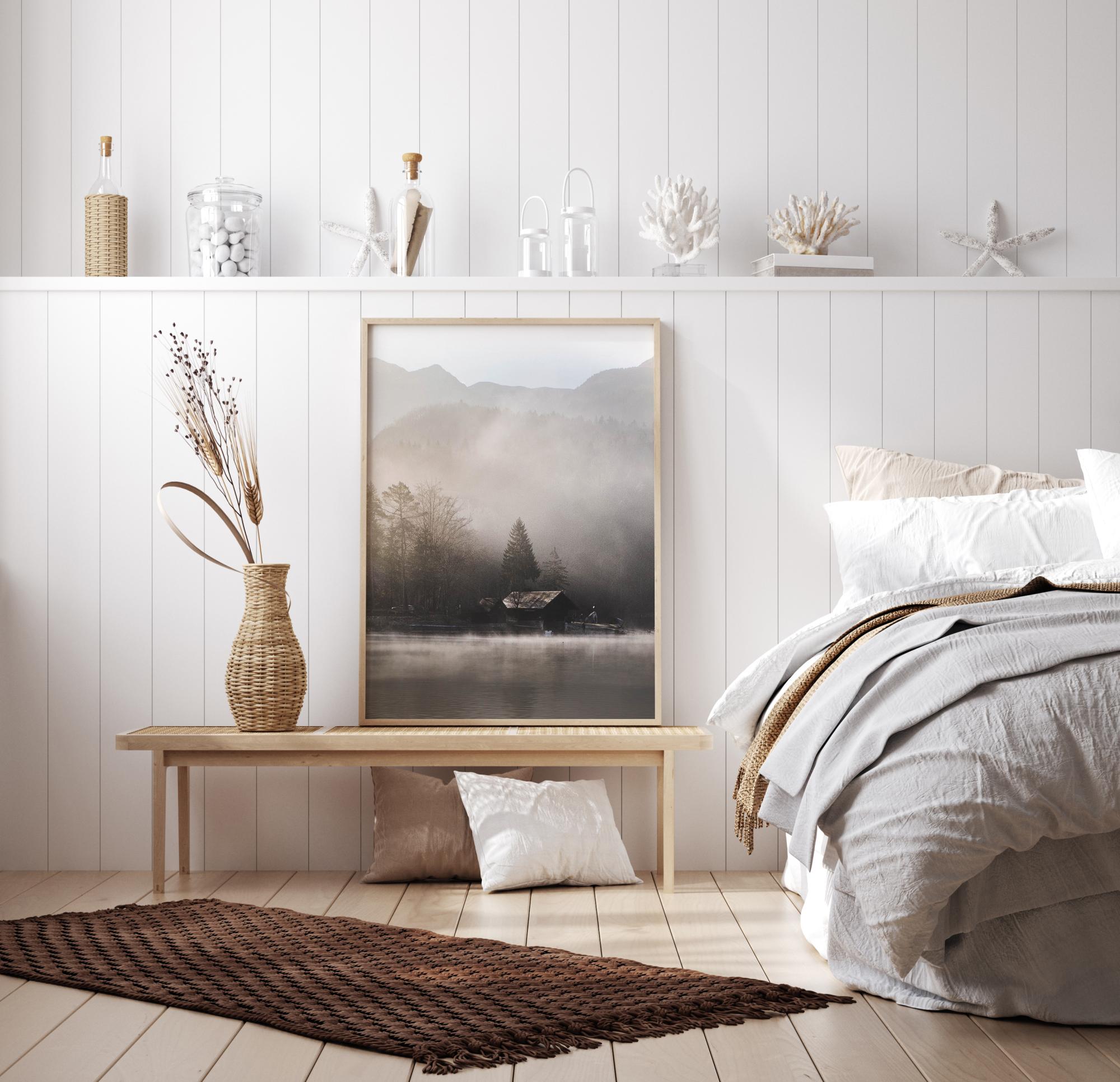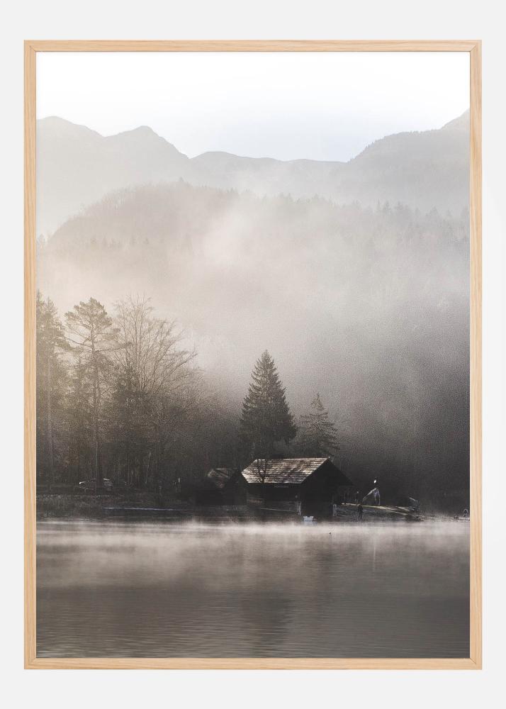 Pohodový plagát s chatou v horách, ktorá sa nachádza na okraji hmlistej jazera. Jemné pastelové farby dodávajú tomuto obrazu jemný pocit, kde ranné slnko žiari z pravej strany, aby zdvihlo hmlu. Zaveste tento plagát na jednoduchú stenu a stratte sa v osamelej divočine a jednoduchosti tohto náladového plagátu.