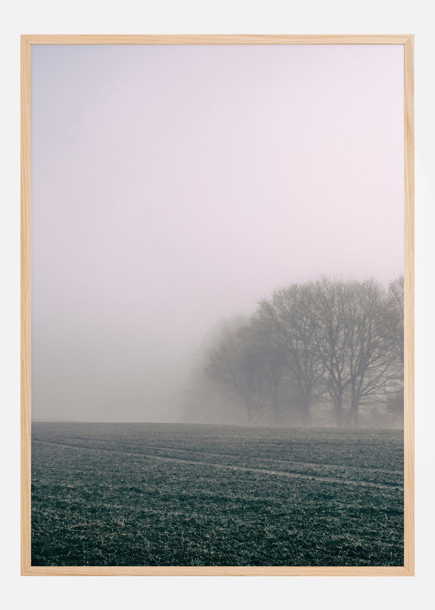 Svetlý plagát s poľom a stromami v rannej hmle. Vychádzajúce slnko zapĺňa fotografiu svetlom, osvetľuje zelené pole a spôsobuje, že hmla sa dvíha. Stromy v hmle vyplnia pozadie tejto veľmi britskej rannej scény.