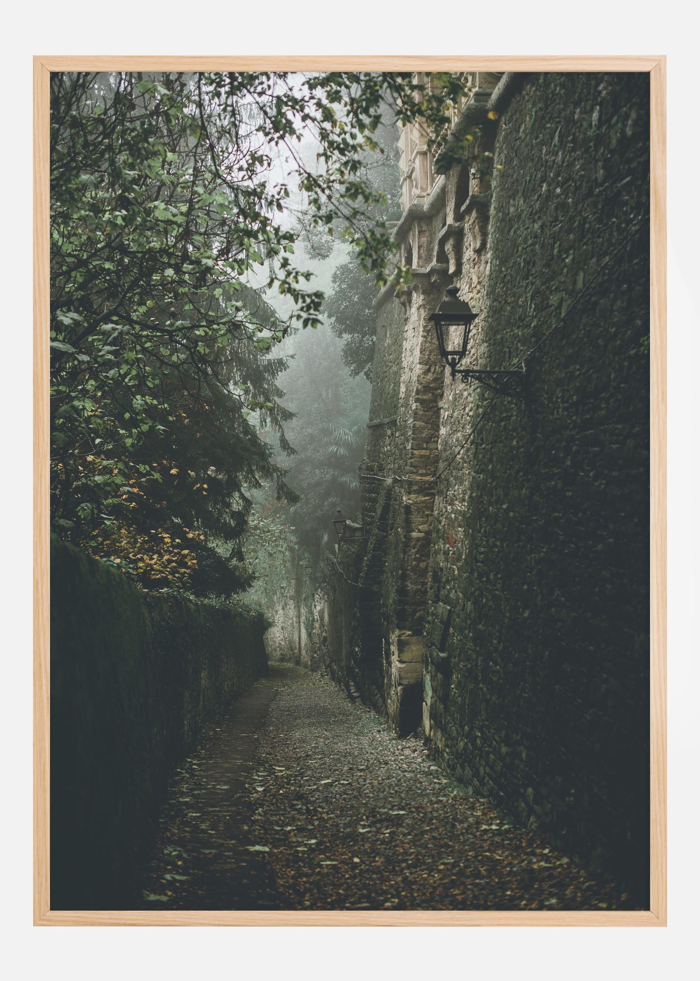 Tento tajomný plagát zachytáva mystickú a očarujúcu uličku zahalenú v hmle a obklopenú múrmi histórie. Ulička, ktorú lemuje machom pokrytá stena a visiace lístie, dodáva pocit, akoby ste vkročili priamo do iného sveta. Starodávna lampa pripevnená na kamennej stavbe posilňuje historický a romantický pocit, ktorý tento obraz vyžaruje.