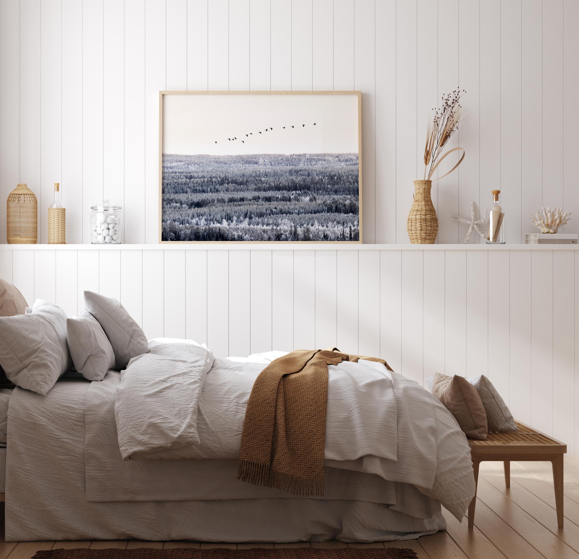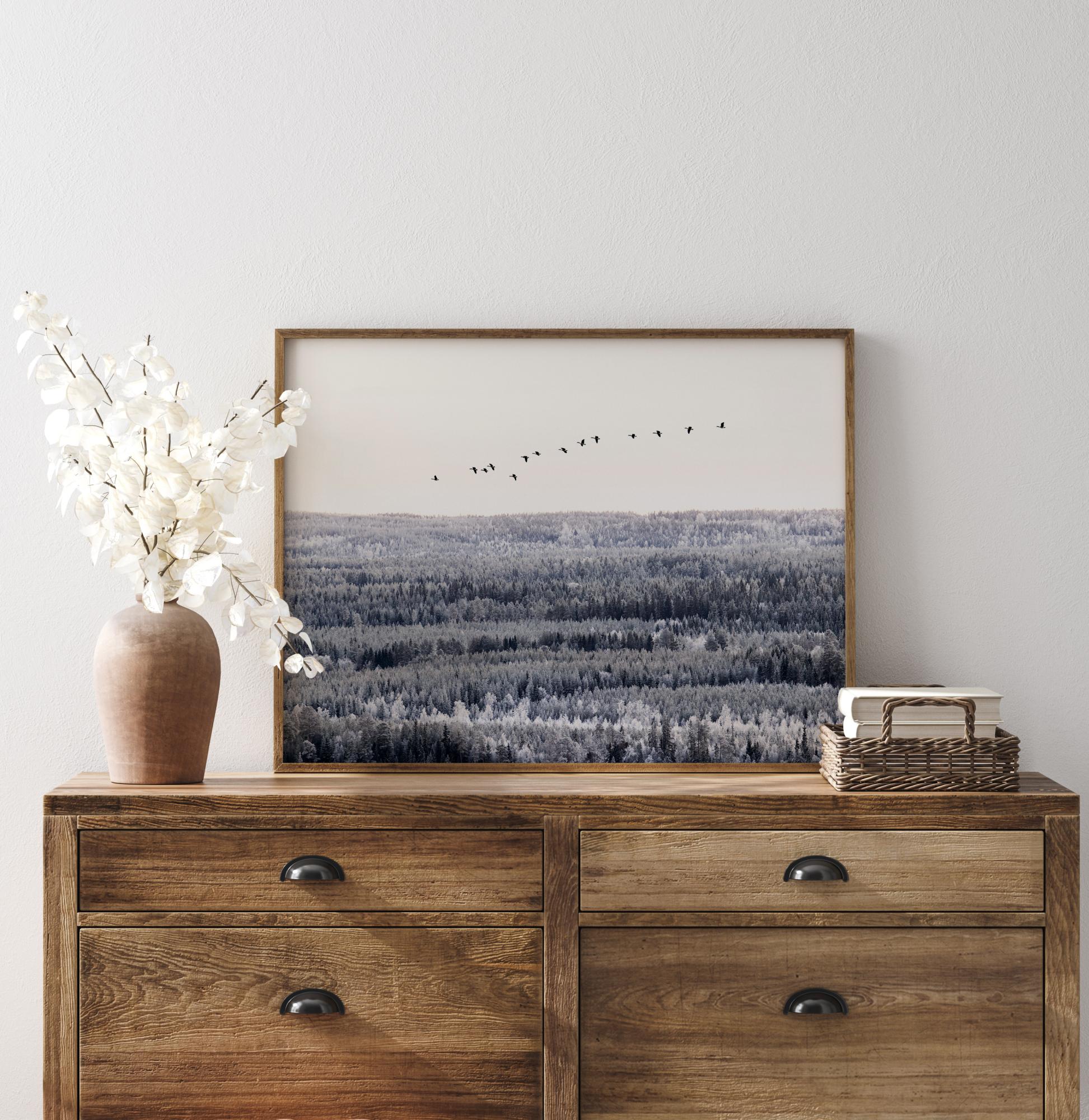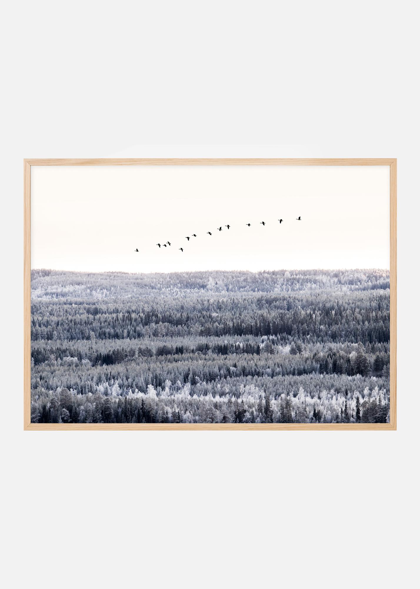 Fotografický plagát znázorňujúci kŕdeľ sťahovavých vtákov letiacich vysoko nad vrcholkami stromov. Rozsiahly les má chladné farebné odtiene pod bielou oblohou. Plagát, ktorý vyžaruje nádherný pocit slobody.