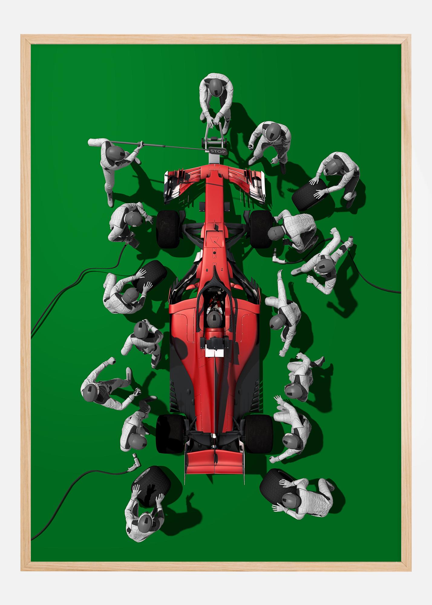 S explóziou farieb a akcie poskytuje tento podmanivý plagát pohľad do adrenalínového sveta Formuly 1. Na odvážne zelenej pozadí je zobrazená ikonická scéna pitstopu, kde tím mechanikov v strieborných a bielych uniformách pracuje v dokonalej synchronizácii okolo ostro červeného pretekárskeho auta. Táto kontrastná kompozícia je poctou umeniu rýchlosti a presnosti motoršportu.