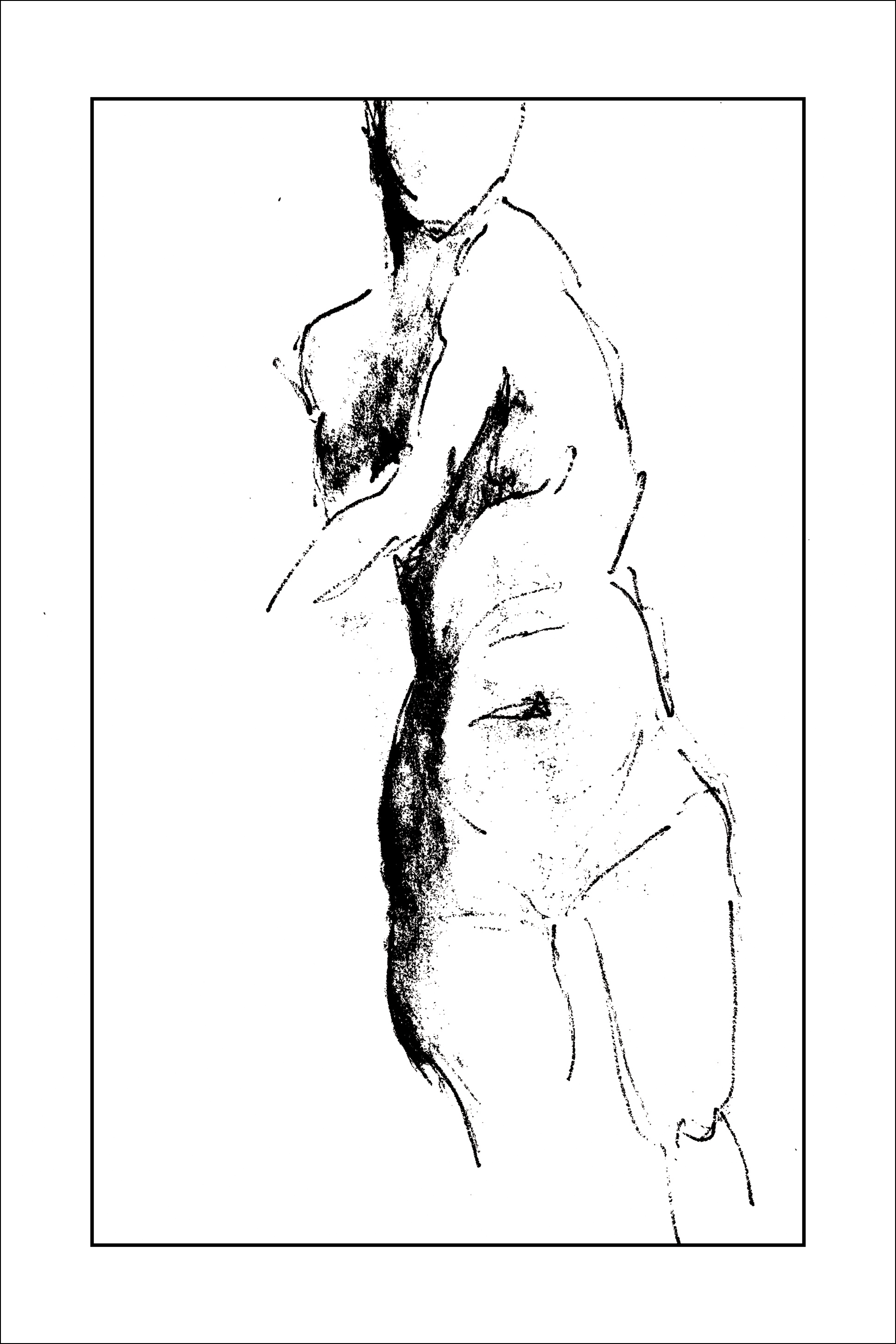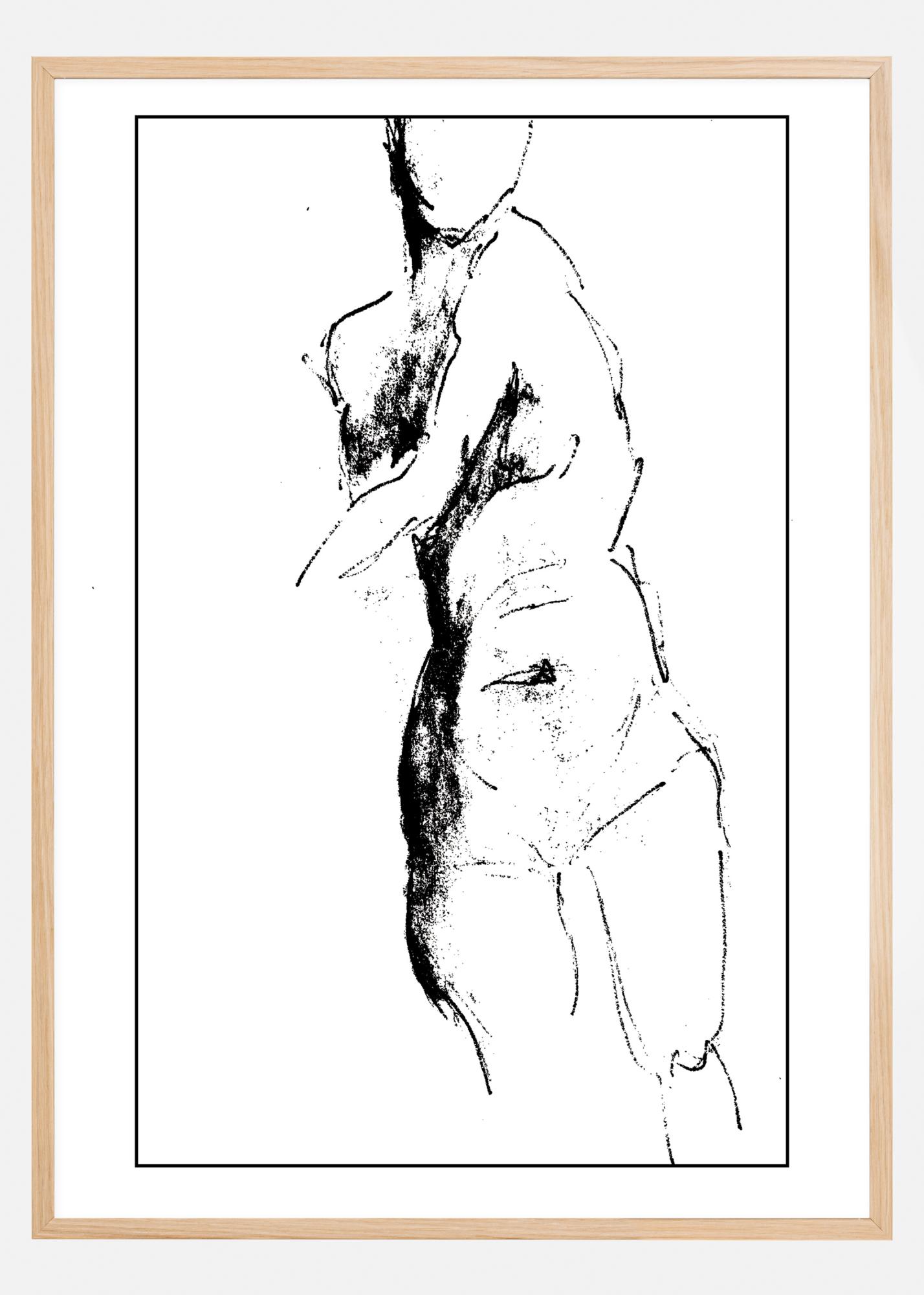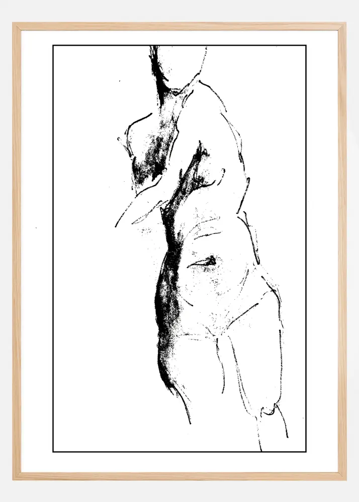 Plagát s kresbou postavy s nahou ženou, ktorá sa otáča. Štýl kresby na tomto obrázku pomáha vytvoriť pocit pohybu, keď sa modelka otáča a prekladá ruky cez hrudník. Táto čiernobiela tlač bude vyzerať úžasne na farebnej stene.