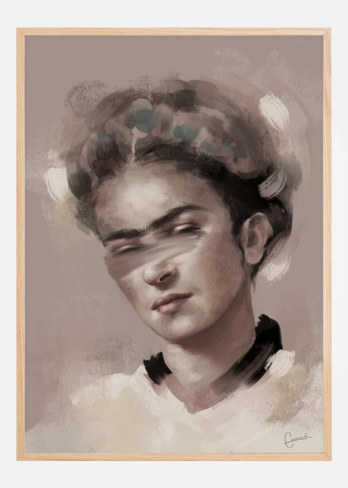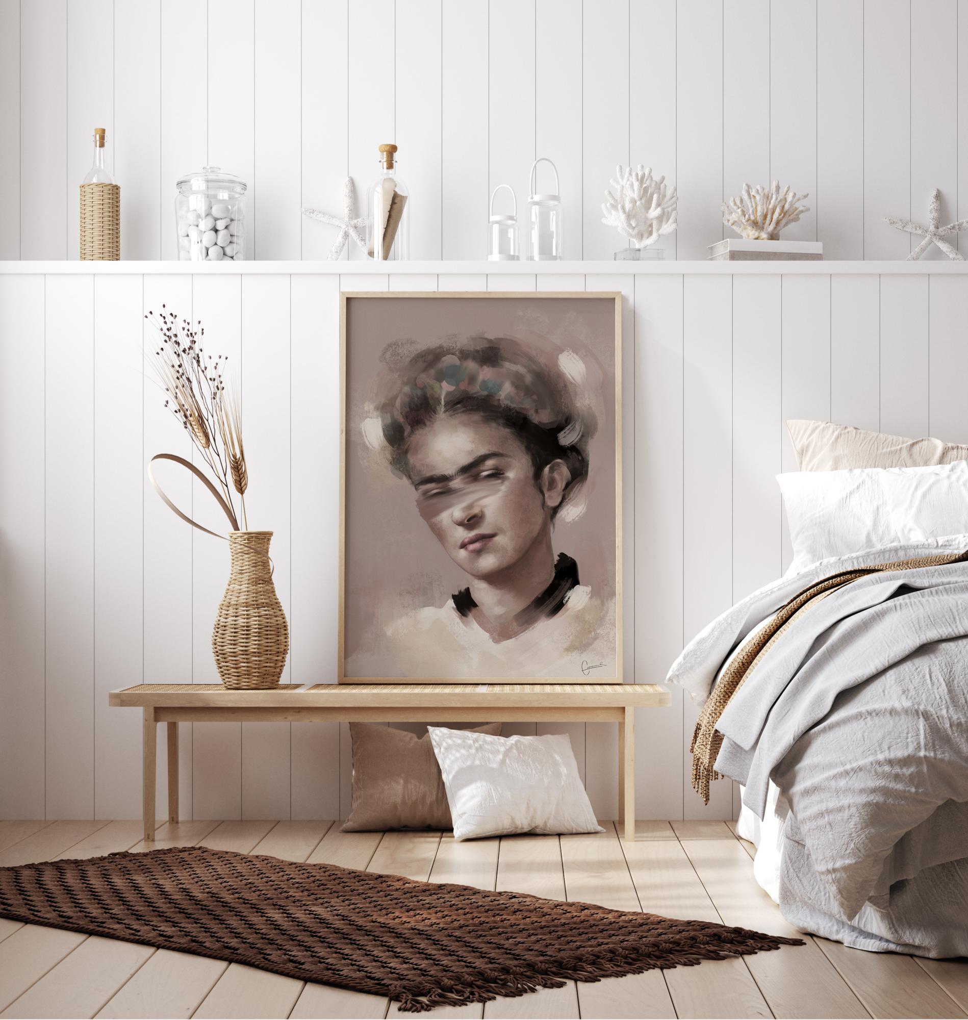 Portrétový plagát s Fridou Kahlo v jemných farbách. Pokojná a pokojná, táto žena hľadí dole s pokojným výrazom na tvári. Jej vlasy a pleť sú v jemných neutrálnych tónoch, ktoré prispievajú k takmer anjelskému pocitu, ktorý vyžaruje. Ukážte svojho obľúbeného umelca s týmto výtlačkom.