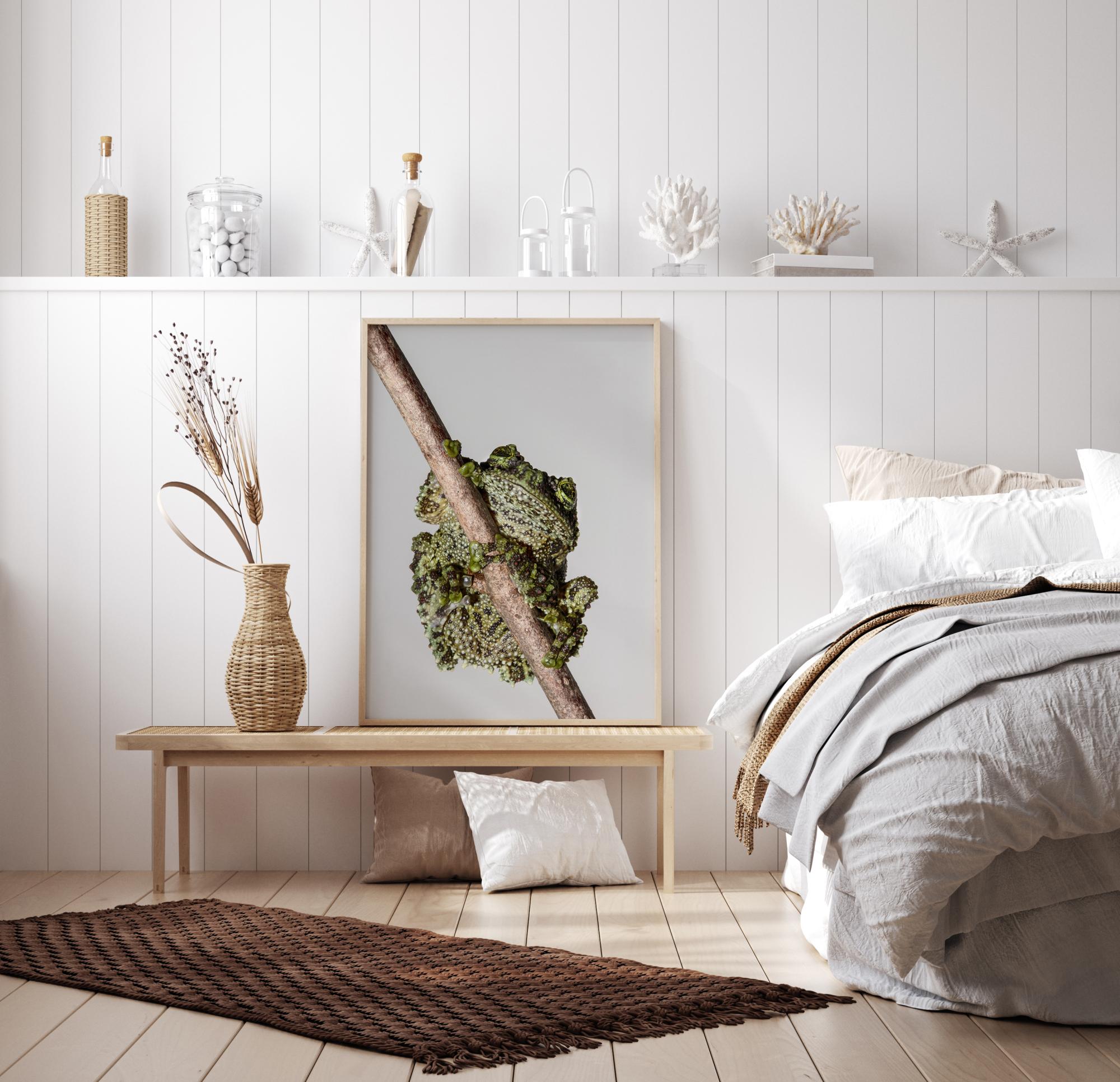 Makroplagát s žabou na strome proti bledomodrej oblohe. Detaily všetkých hrbolčekov a výrastkov žaby sú jasne viditeľné, zatiaľ čo sa pevne drží na tenkej vetve. Oči a ústa pozerajú ponad vetvu na rozkošnom a očarujúcom obrázku, ktorý by sa cítil doma na akejkoľvek stene.
