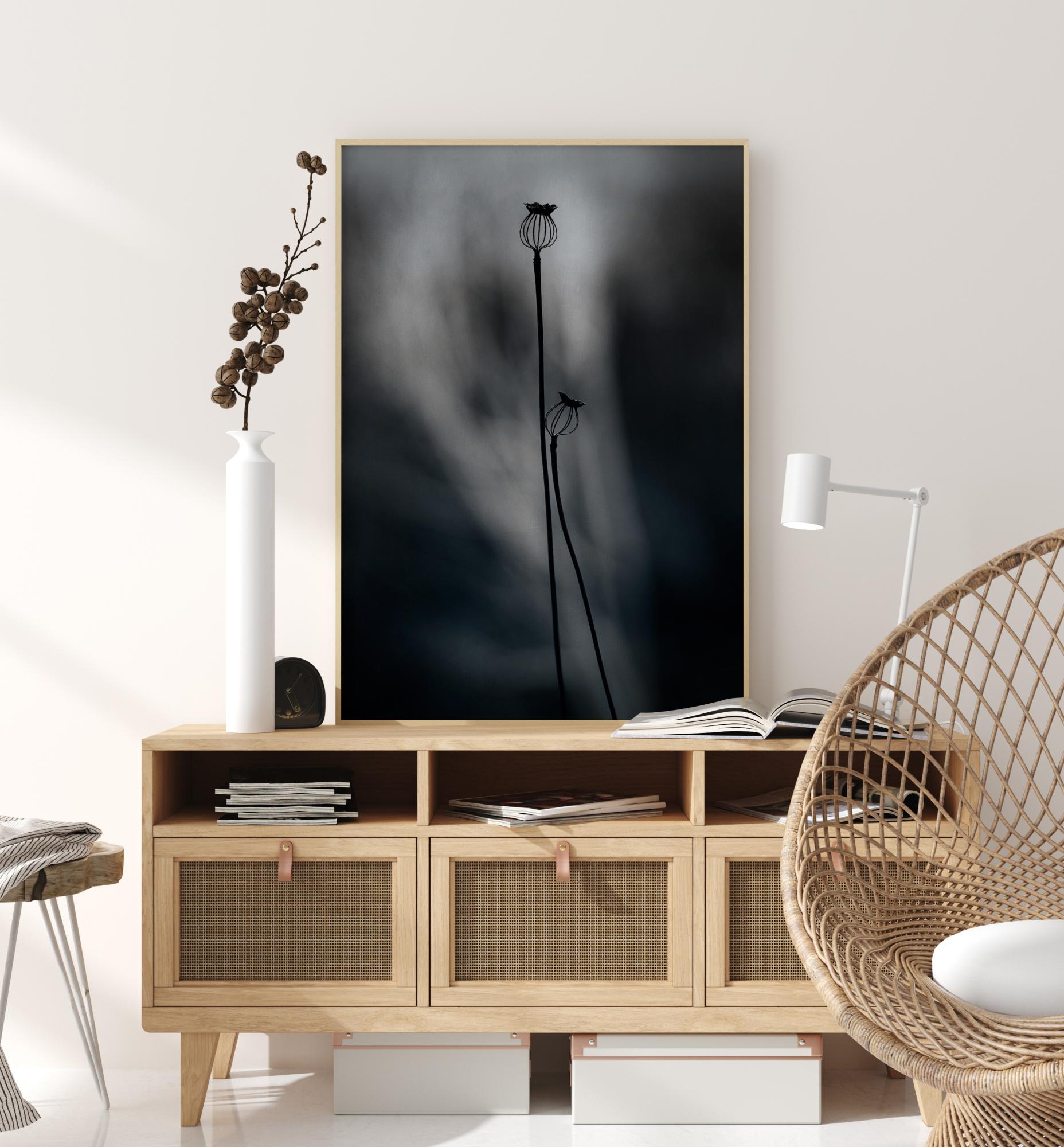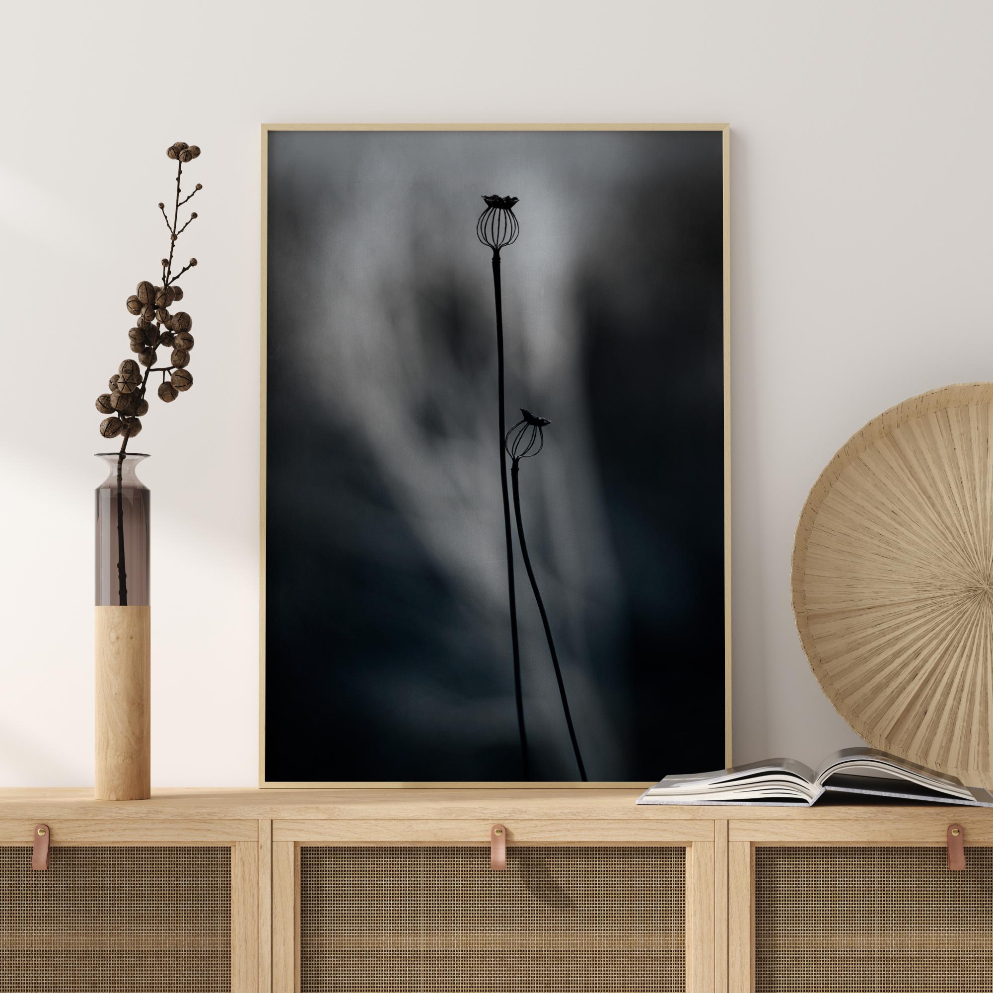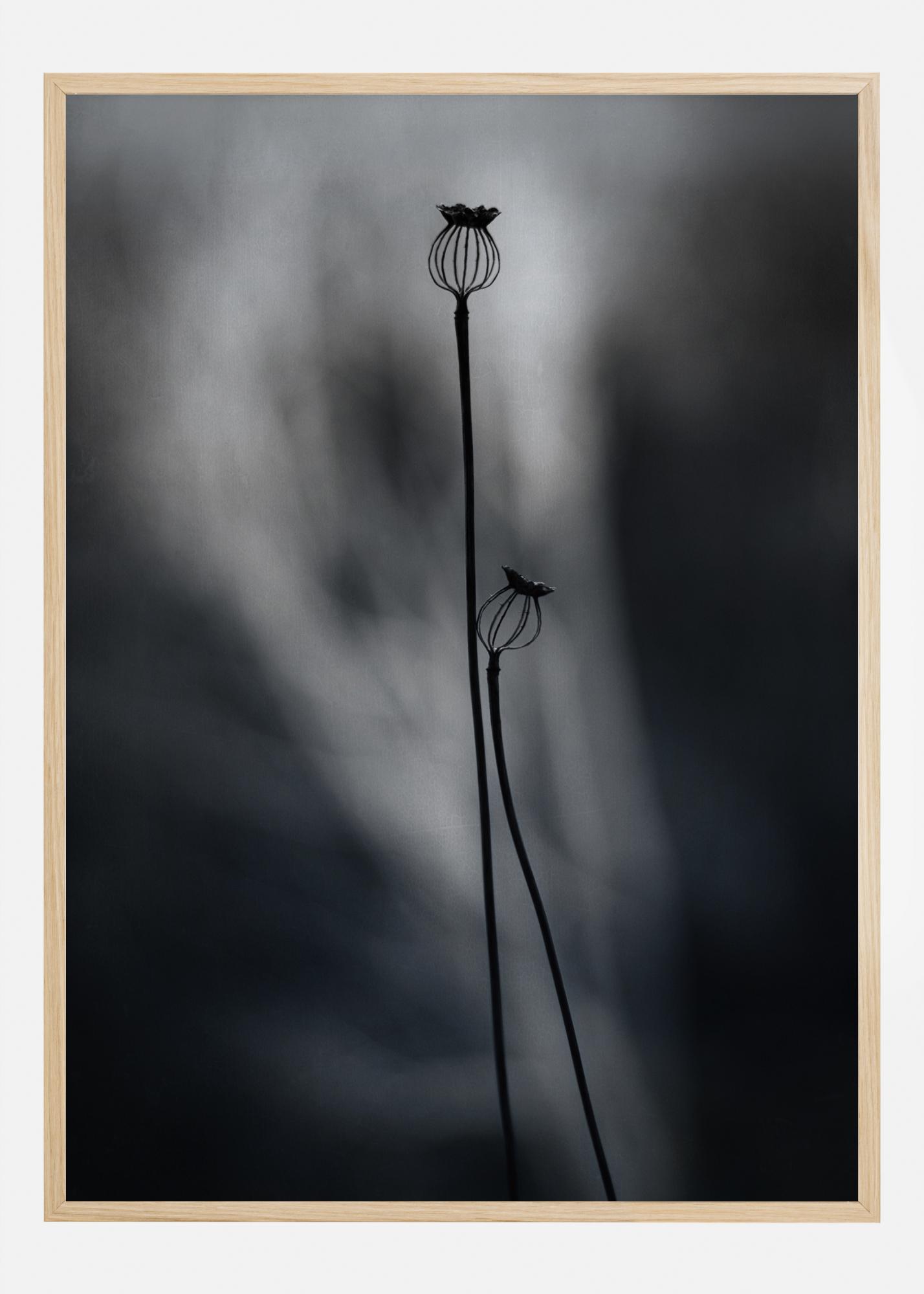 Eterický plagát dvoch makových toboliek na mierne rozmazanom pozadí za nimi. Tento abstraktný obraz ťa uchváti na mnoho hodín. Prineste si do svojho domova túto úžasnú zmes pokoja a pohybu.