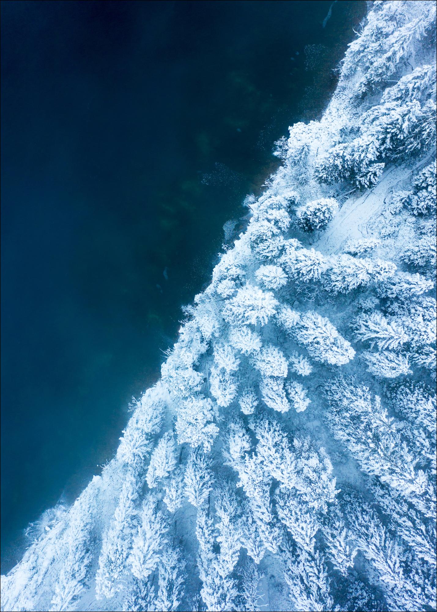 Vzrušujúci fotografický plagát z pohľadu vtáčej perspektívy, kde sa zasnežený les stretáva s modro zamrznutým morom v ostrej diagonále. Krásny prírodný plagát v studených tónoch, ideálny ako súčasť väčšej koláže.
