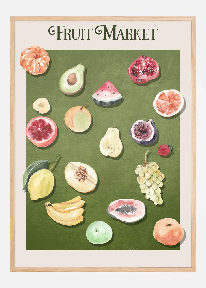 Tento pestrofarebný plagát zachytáva podstatu živej ovocnej tržnice a je fantastickým doplnkom našej kolekcie interiérového umenia. Tlač je pastvou pre oči s radom šťavnatého ovocia predstaveného na bohatej zelenej pozadí, čo vytvára pocit čerstvosti a hojnosti. Od slnkom dozretých citrusových plodov po tropické akcenty avokáda a granátového jablka, toto dielo ponúka vizuálnu hostinu, ktorá inšpiruje a skrášľuje. Každé ovocie je zobrazené s detailnou presnosťou, ktorá zvýrazňuje ich jedinečné textúry a tvary, čo robí tento plagát nevyhnutnosťou pre každého, kto ocení realistické umenie.