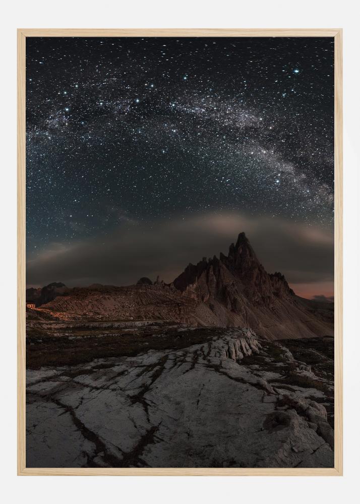 Fantastický plagát s masívom Dolomitov a galaxiou nad ním. Červené útesy sa dvíhajú vysoko k hviezdam. Mliečna dráha sa klenie nad nimi so skupinou jasne trblietajúcich sa hviezd a vytvára magickú scénu. Zaveste si ho na stenu a uneste sa do fantastického sveta.