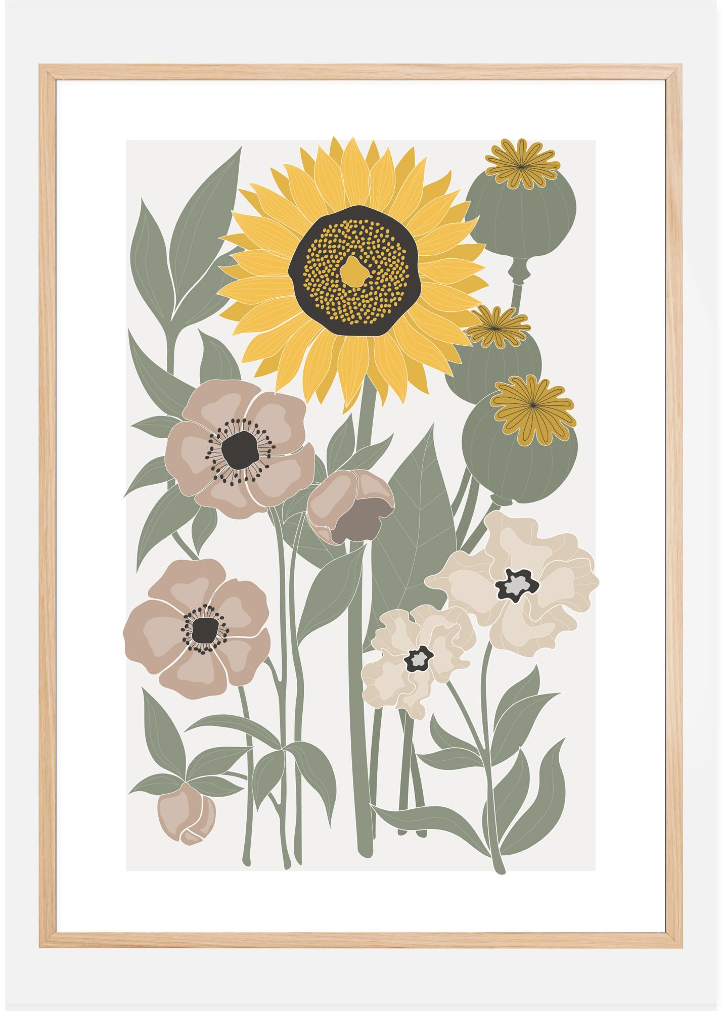 Mäkký plagát s rôznymi kvetmi. Svetlá slnečnica dominuje v strede obrazu spolu s ďalšími kvetmi ako mak v tomto záhradnom plagáte. Jednoduchý štýl uľahčuje vidieť detaily a vychutnať si tento slnečný obraz.