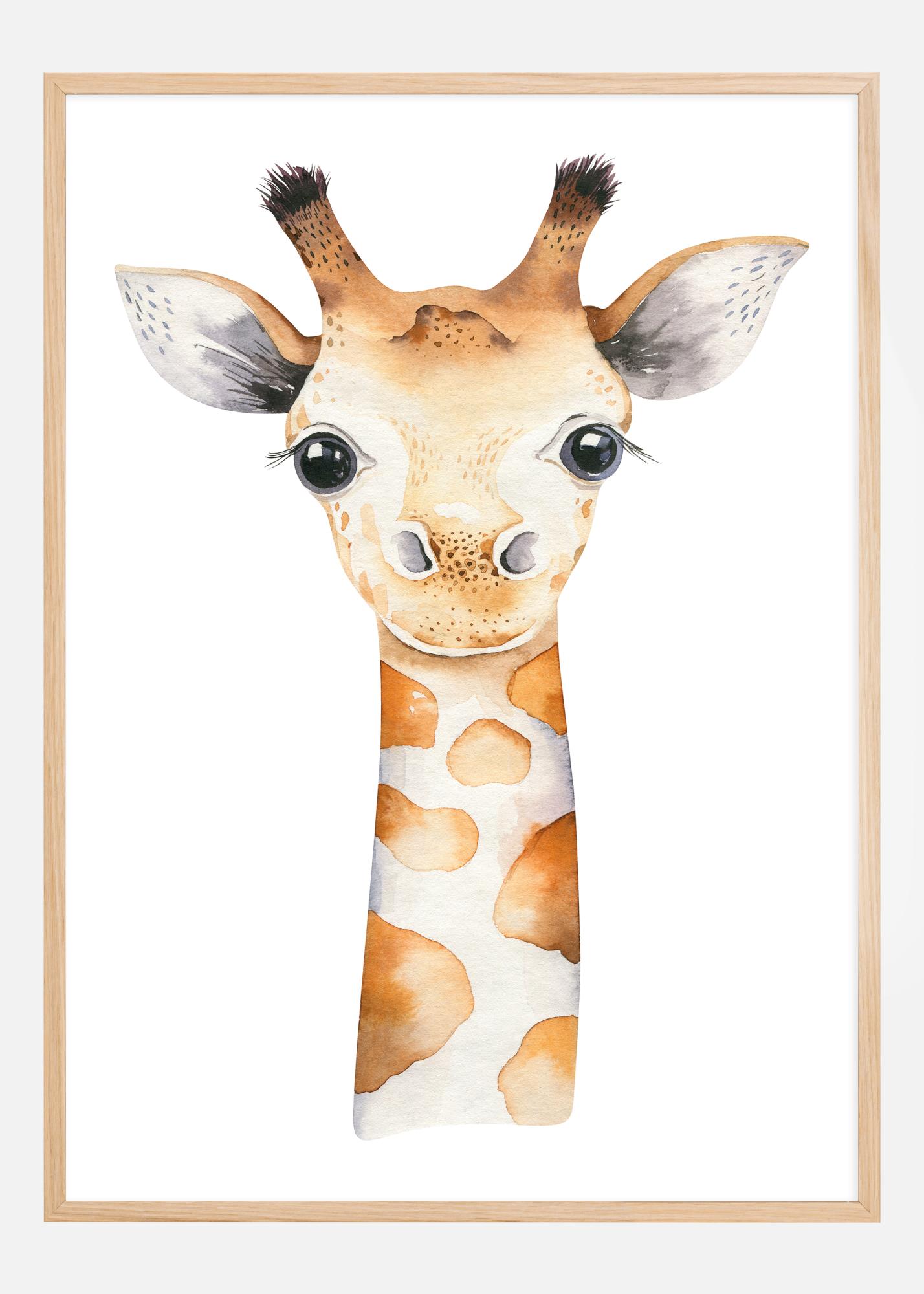 Tento rozkošný portrét mladej žirafy, vytvorený akvarelom, je plagát, ktorý žiari šarmom a teplom. S jeho veľkými, zvedavými očami a charakteristickými škvrnami, ktoré hravo tancujú po jeho dlhom krku, prináša tento print pocit radosti a hravosti do akéhokoľvek priestoru. Jeho jemné farby v béžovej, hnedej a bielej vytvárajú pokojnú a zároveň radostnú atmosféru.