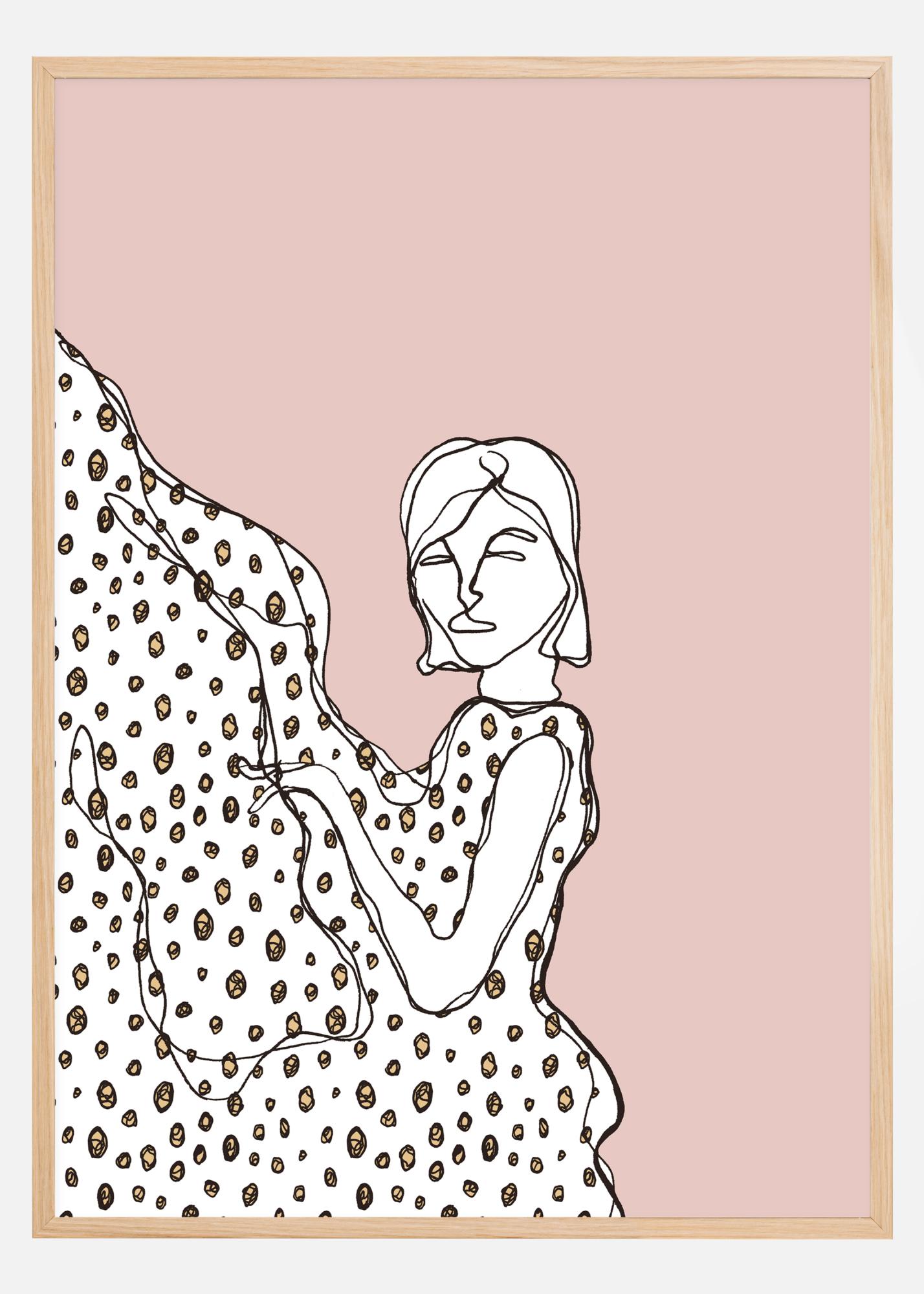 Jednoduchý plagát s náčrtom dievčaťa v bodkovaných šatách. Hrubý náčrt dievčaťa vytvára pohyb, keď si točí šaty nahor. Jednoduché bodky vynikajú na bledo ružovom pozadí, pred ktorým stojí. Zachyťte jej pohľad, keď sa na vás pozerá.