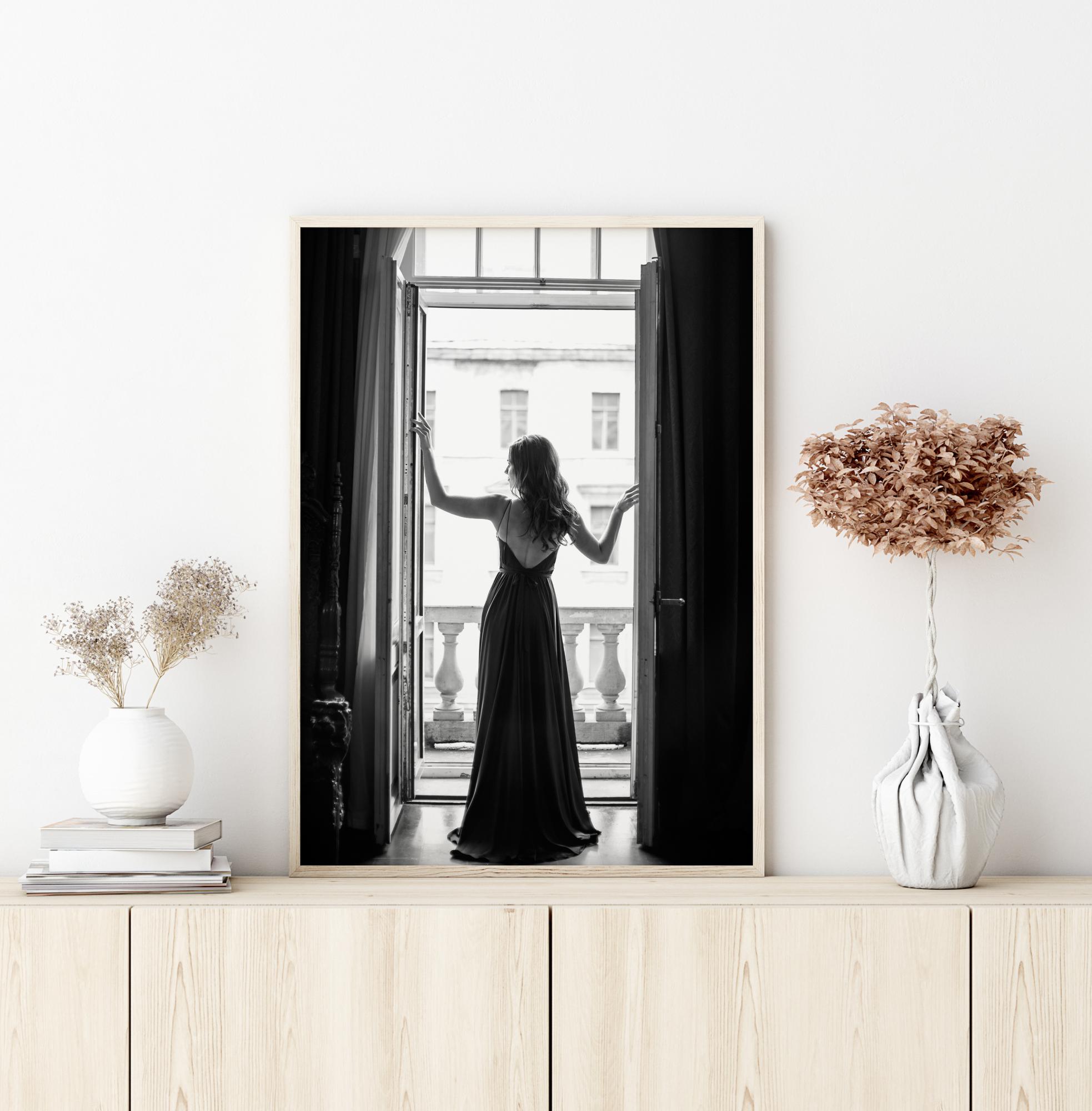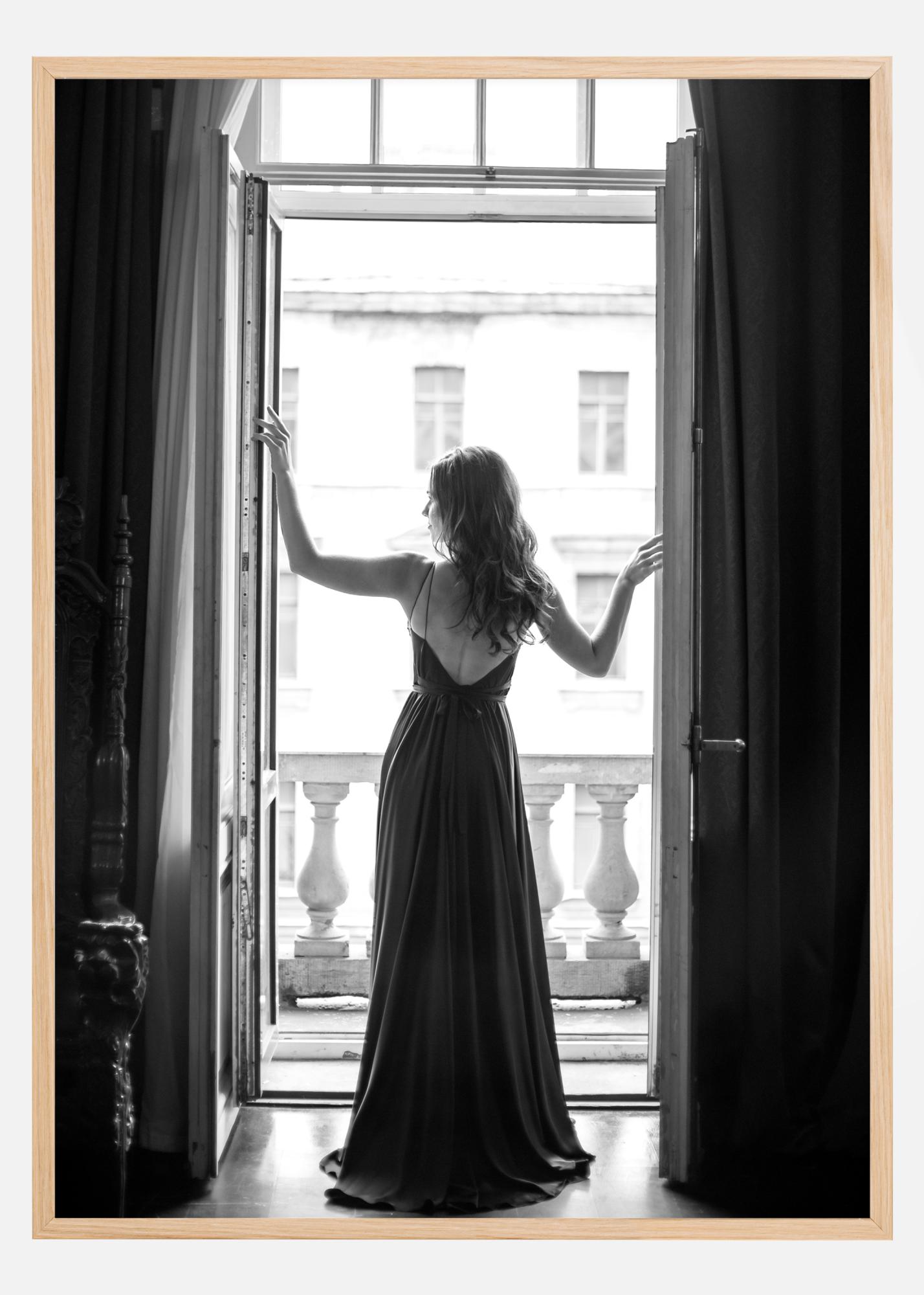 Čierno-biela fotografia ženy v dlhých šatách stojacej pri dokorán otvorených balkónových dverách, hľadiacej von na deň. Pred ňou sa mihajú ošúchané betónové stĺpy a ošarpaná stará fasáda. Plagát, ktorý dýcha nádhernou zmesou krásy a života v kontraste so starým a vetrom ošľahaným.