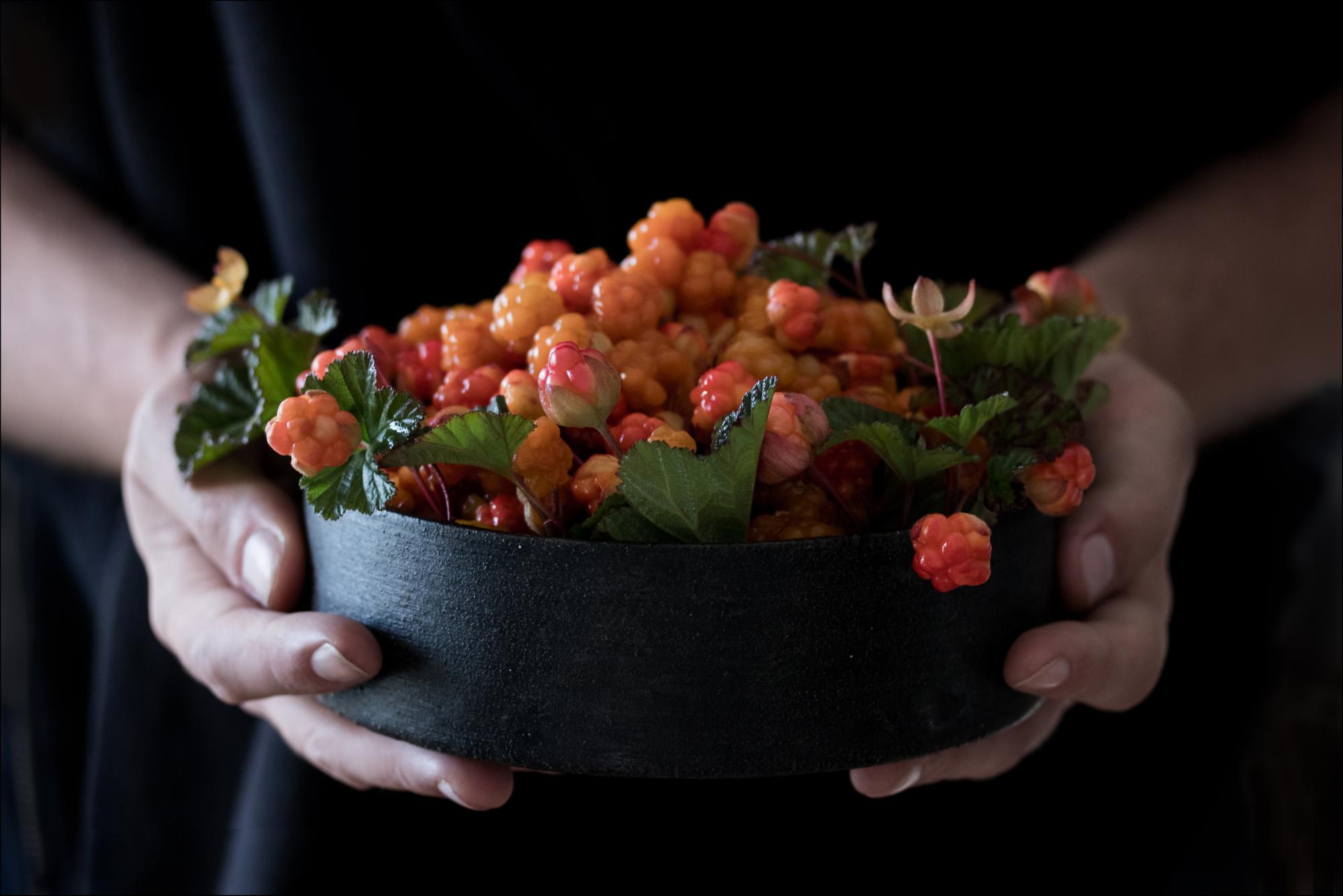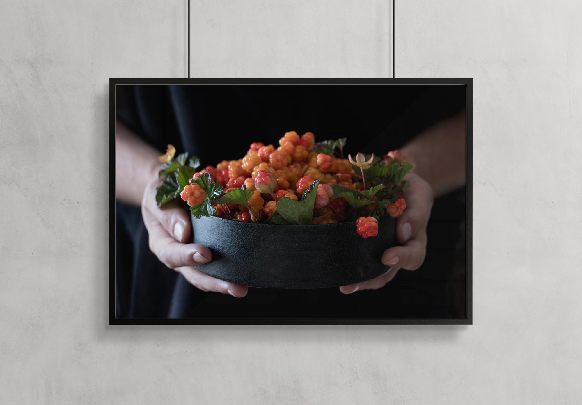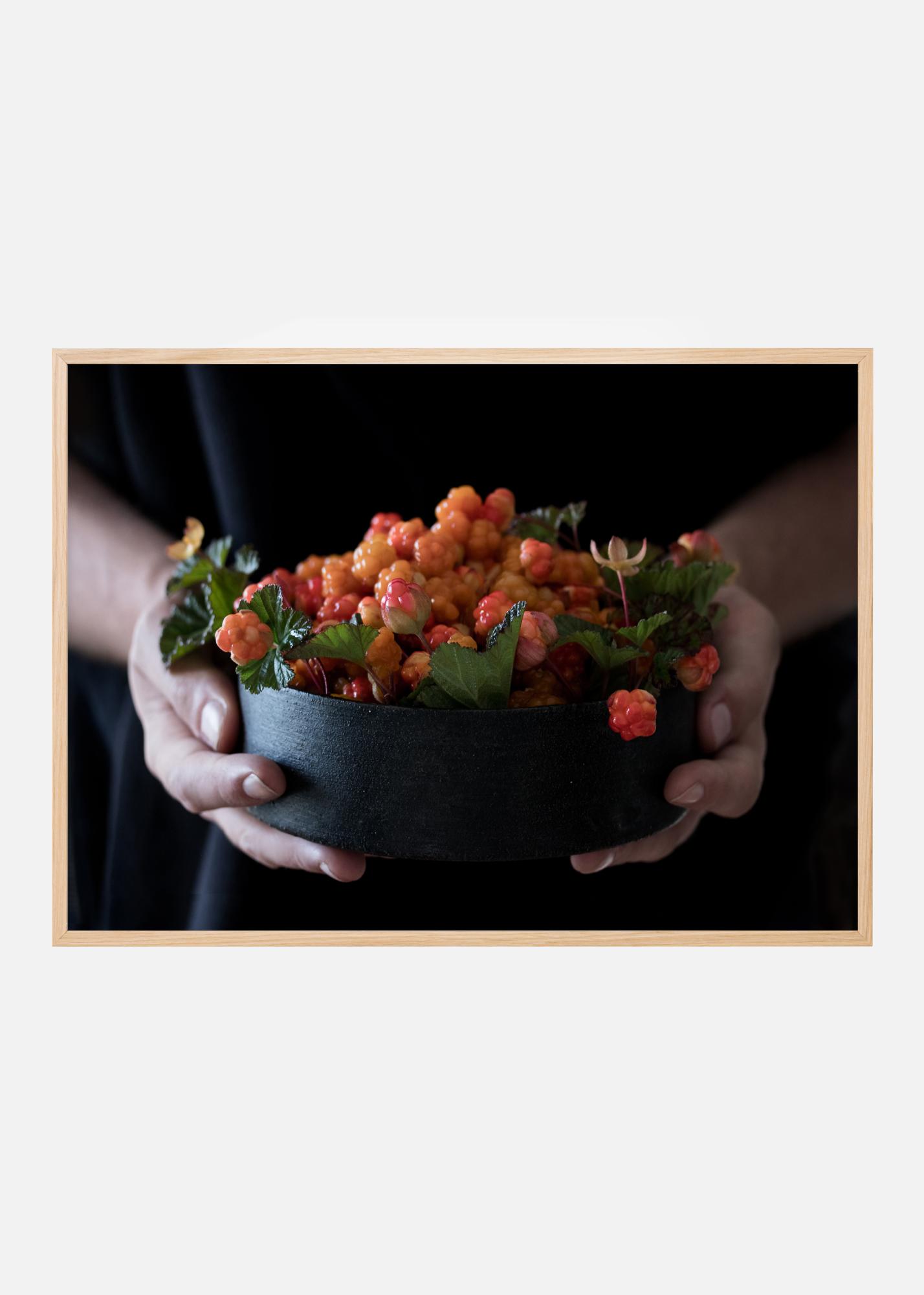 Poster ovocia so zlatými plodmi, ktoré ležia v miske držiacej dvoma rukami. Táto svieža fotografia zobrazuje zlaté plody a listy v jednoduchej čiernej miske. Dve ruky ju chytajú a držia pred vami, akoby ju práve chceli odovzdať vám.
