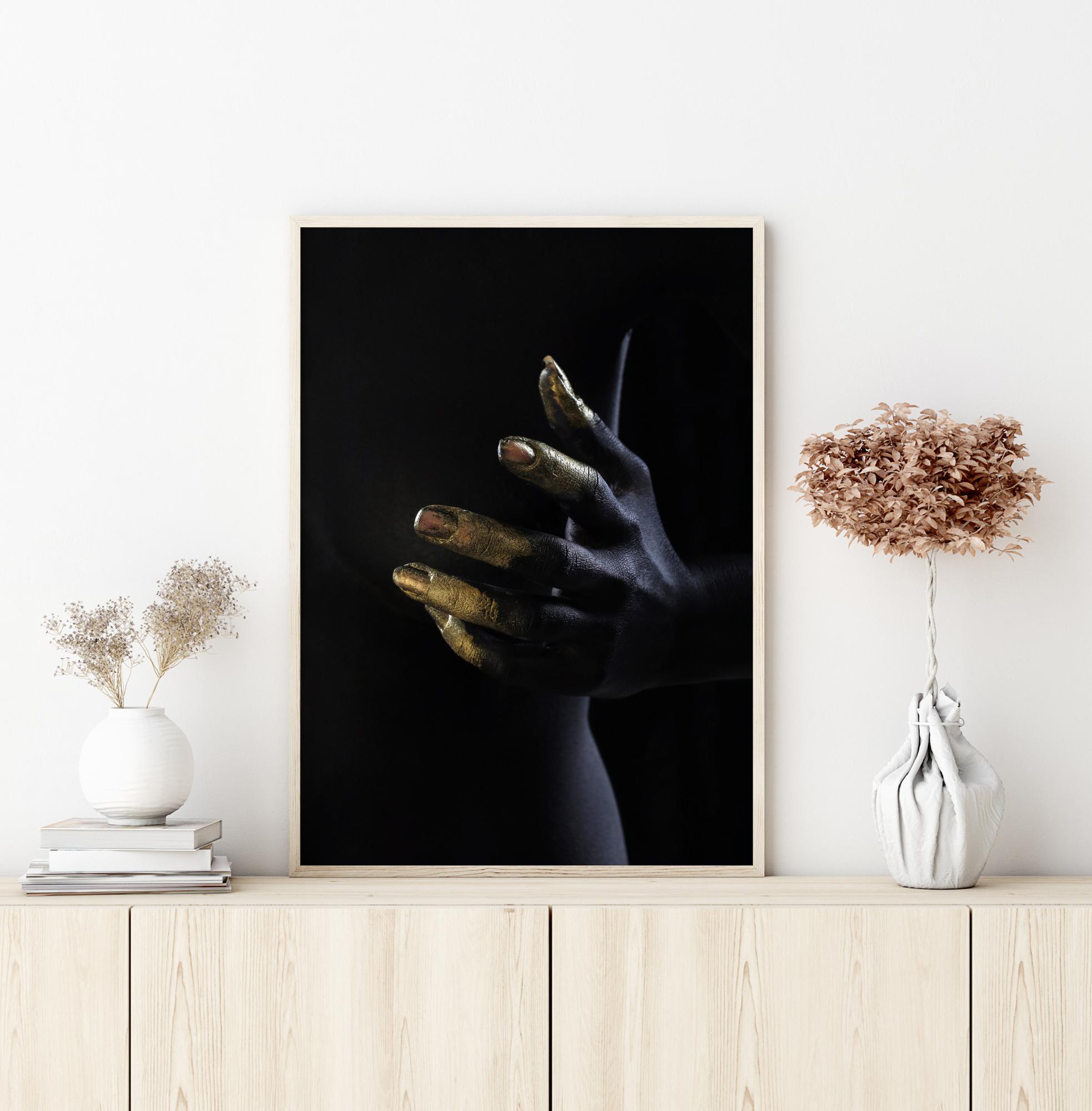 Kontrastný plagát plný dramatu s rukou, ktorá je natiahnutá dopredu. Polovica ruky je čierna, zatiaľ čo prsty sú natreté zlatou farbou, keď je ruka natiahnutá. Časť tela je viditeľná, osvetlená svetlom z pravej strany, aby vynikla z čierneho pozadia. Skutočne umelecký obraz, ktorý je ideálny pre neutrálne steny.