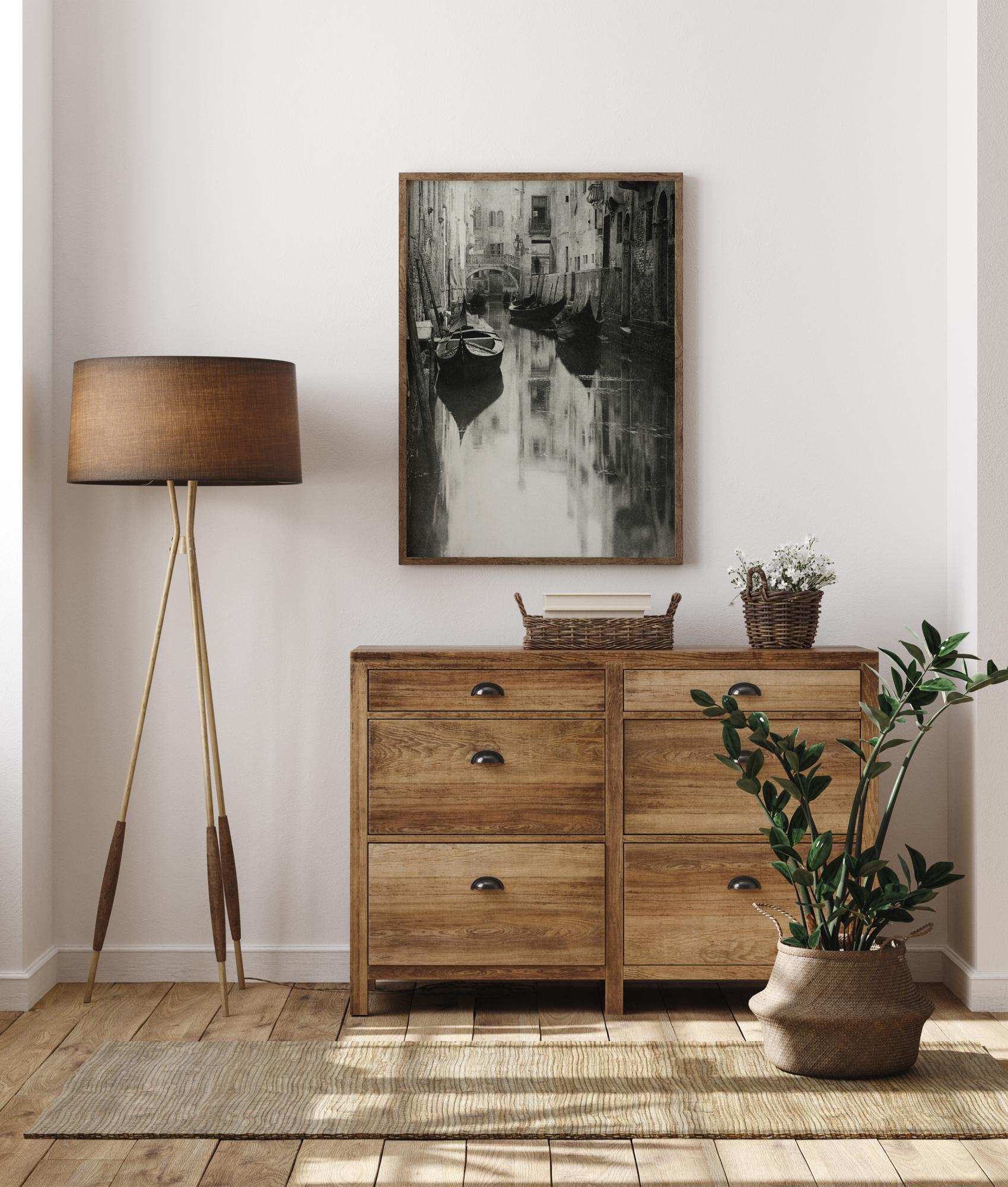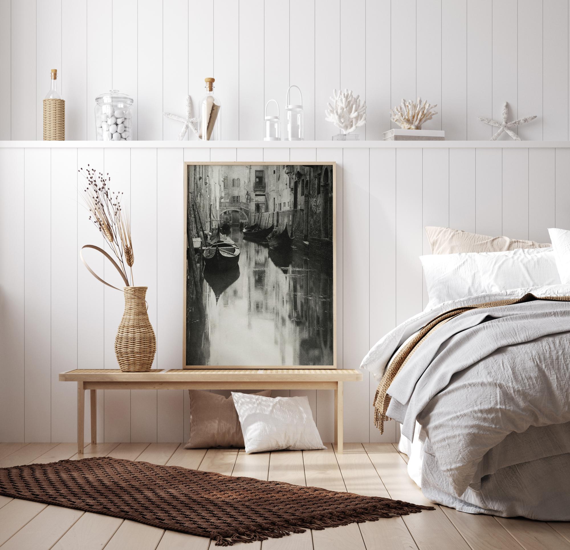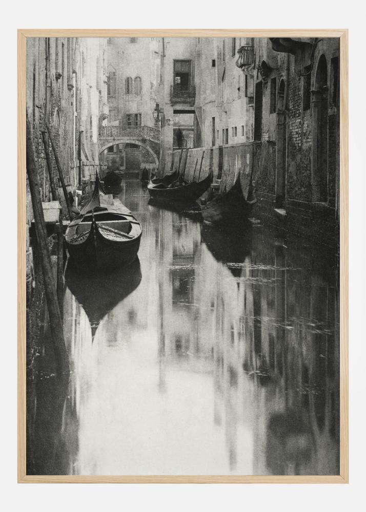 Čiernobiely plagát s gondolami zakotvenými v kanáli v Benátkach. Člny pokojne stoja na tichej vode vedľa strmých strán domov. Obraz prekypuje pokojom a tichom v tejto odľahlej časti mesta.