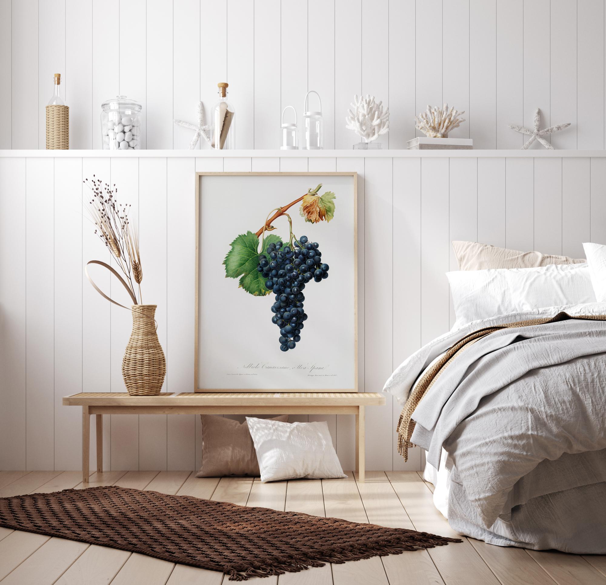 Podrobný botanický plagát s množstvom tmavomodrých hrozna na vinnej réve visiacej v strede na bielom pozadí. Lesklé čiernomodré hrozno vyzerá šťavnaté a chutné a lákavo sa hojdá v strede obrazu. Zaveste si ho do kuchyne pre inšpiráciu k jedlu.