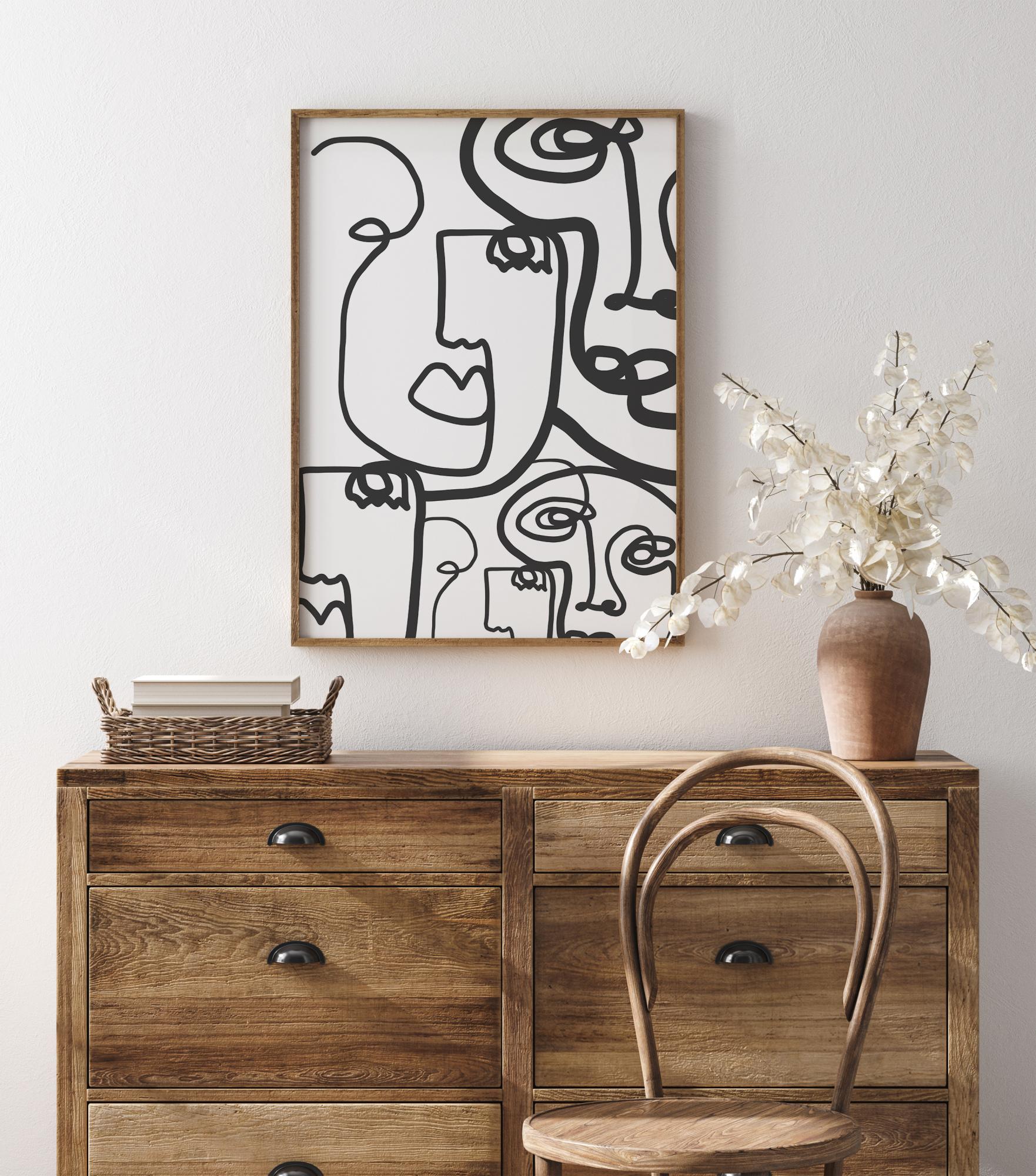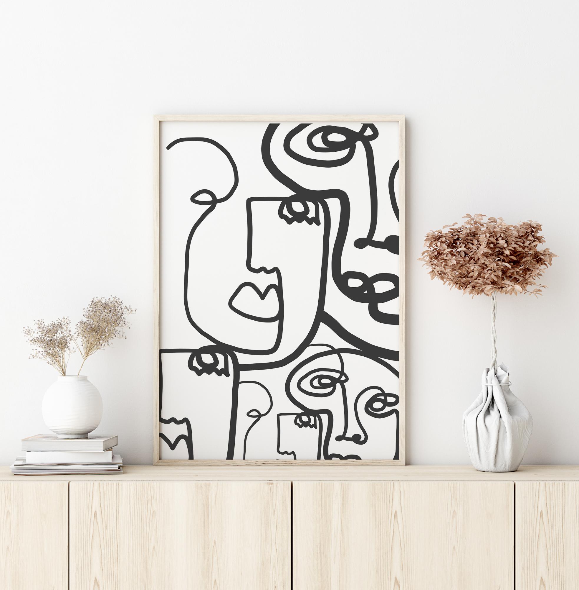 Dramatický abstraktný plagát s množstvom nakreslených tvárí. Hrubé a tenké čierne línie vypĺňajú tento obraz, aby vytvorili päť samostatných tvárí. Línie sa krútia po bielom pozadí, takže sa musíte sústrediť, aby ste našli všetky tváre, ktoré sa skrývajú v tomto živom obraze.