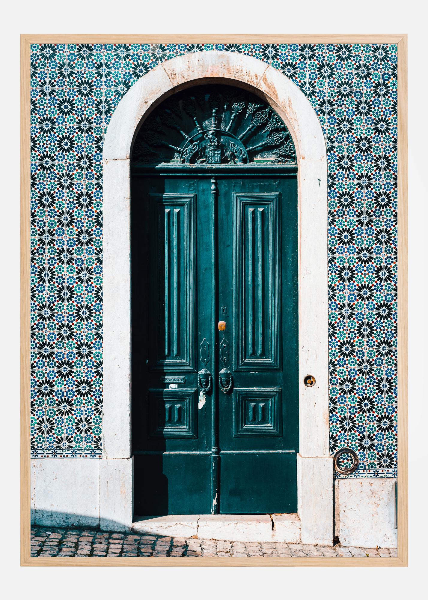 Tento štýlový plagát zobrazuje majestátne zelené dvere, ktoré sú krásne orámované tradičnými, detailnými dlaždicami v modrej a bielej farbe. Klasický dizajn a výrazná farba dverí kontrastujú so zložitými vzormi, čo vytvára pocit pohostinnosti a kultúrneho bohatstva. Obraz prenáša pocit pozývajúceho vchodu do domu, ktorý je plný histórie a charakteru.