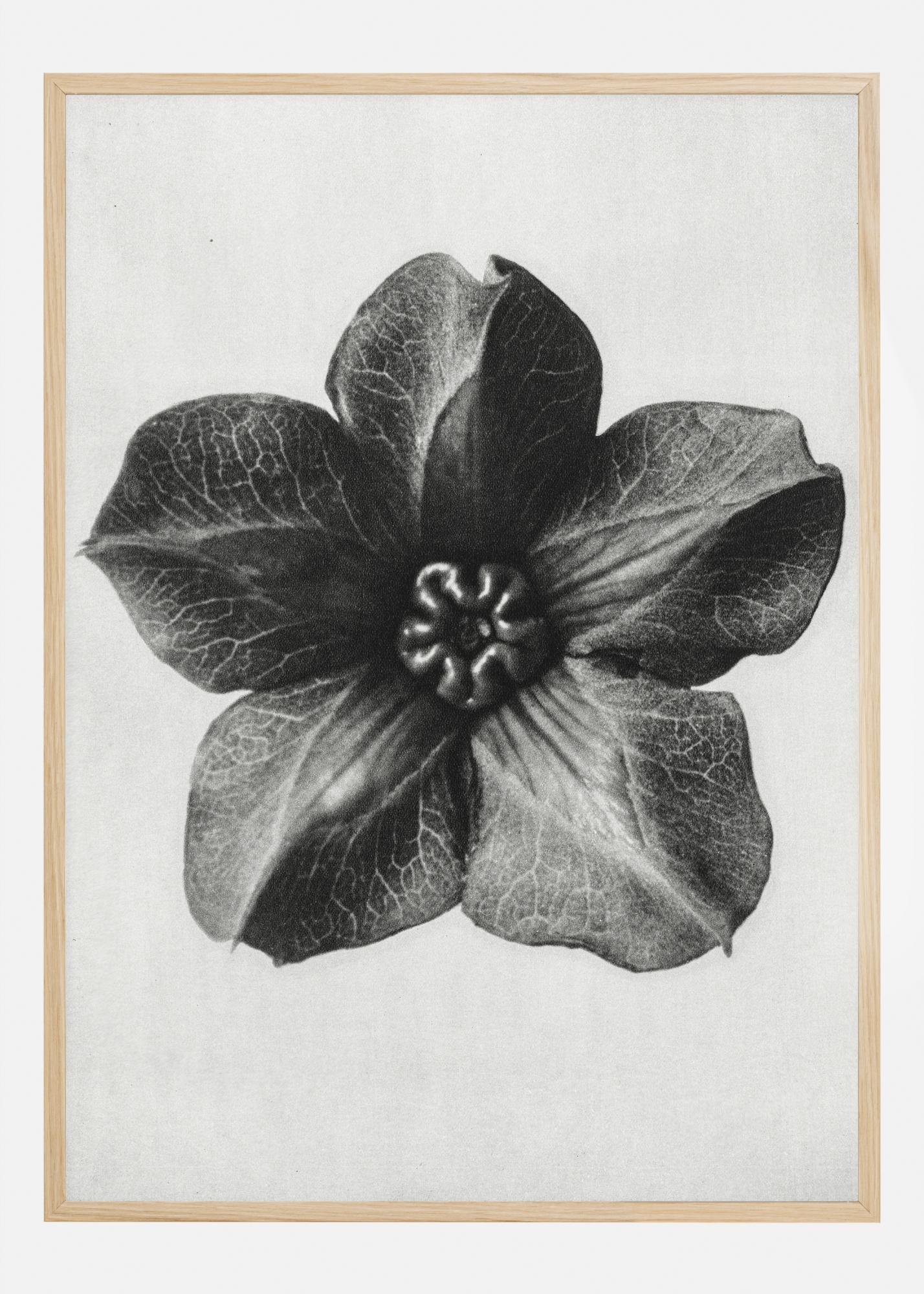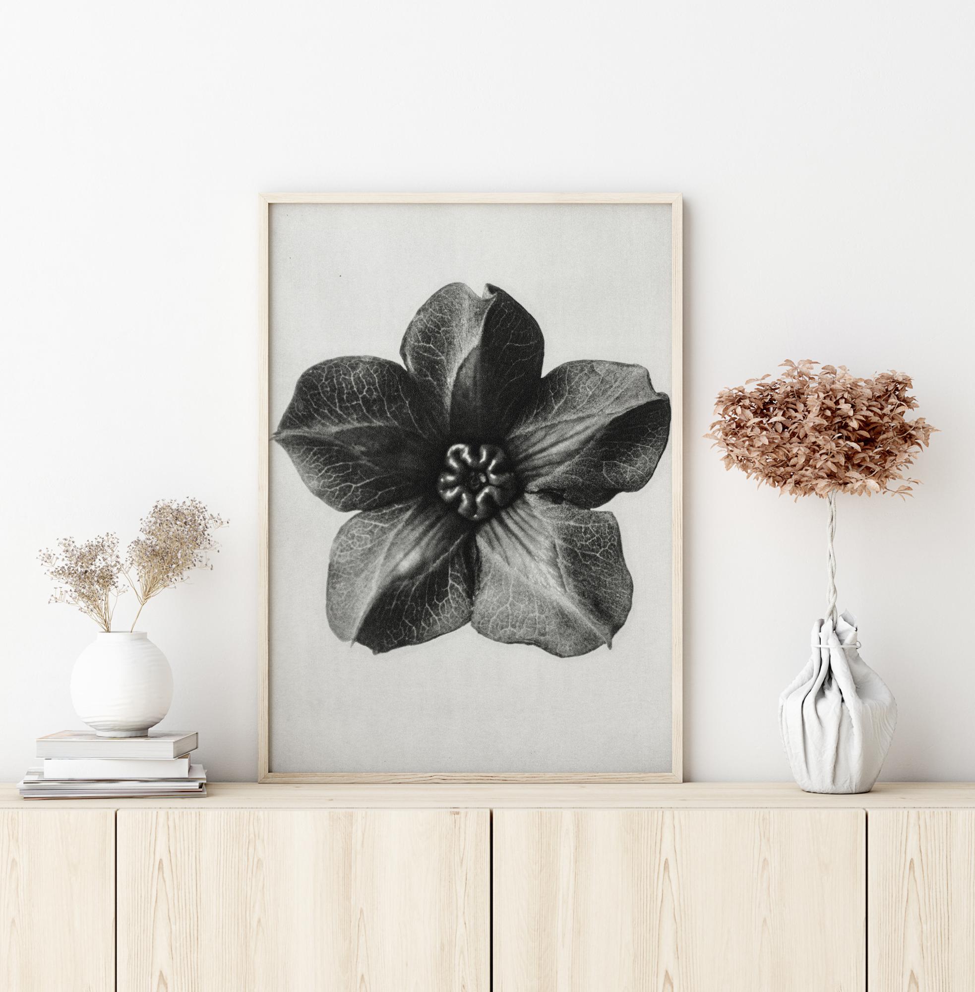 Krásna botanická tlač s osamelou rastlinou v plnom kvete. Jednoduchá, ale krásna tlač maľovaná v čiernobielom zobrazuje päťlupienkový kvet. Ozdobte svoju stenu botanickým plagátom, aby ste vytvorili prírodný pocit vo svojom domove.