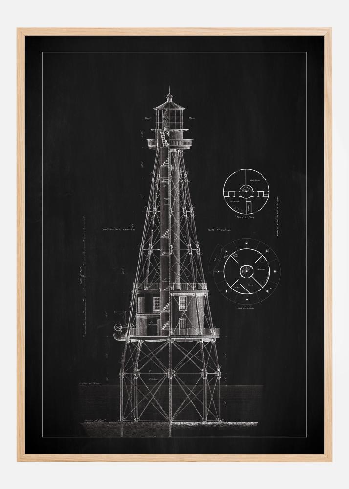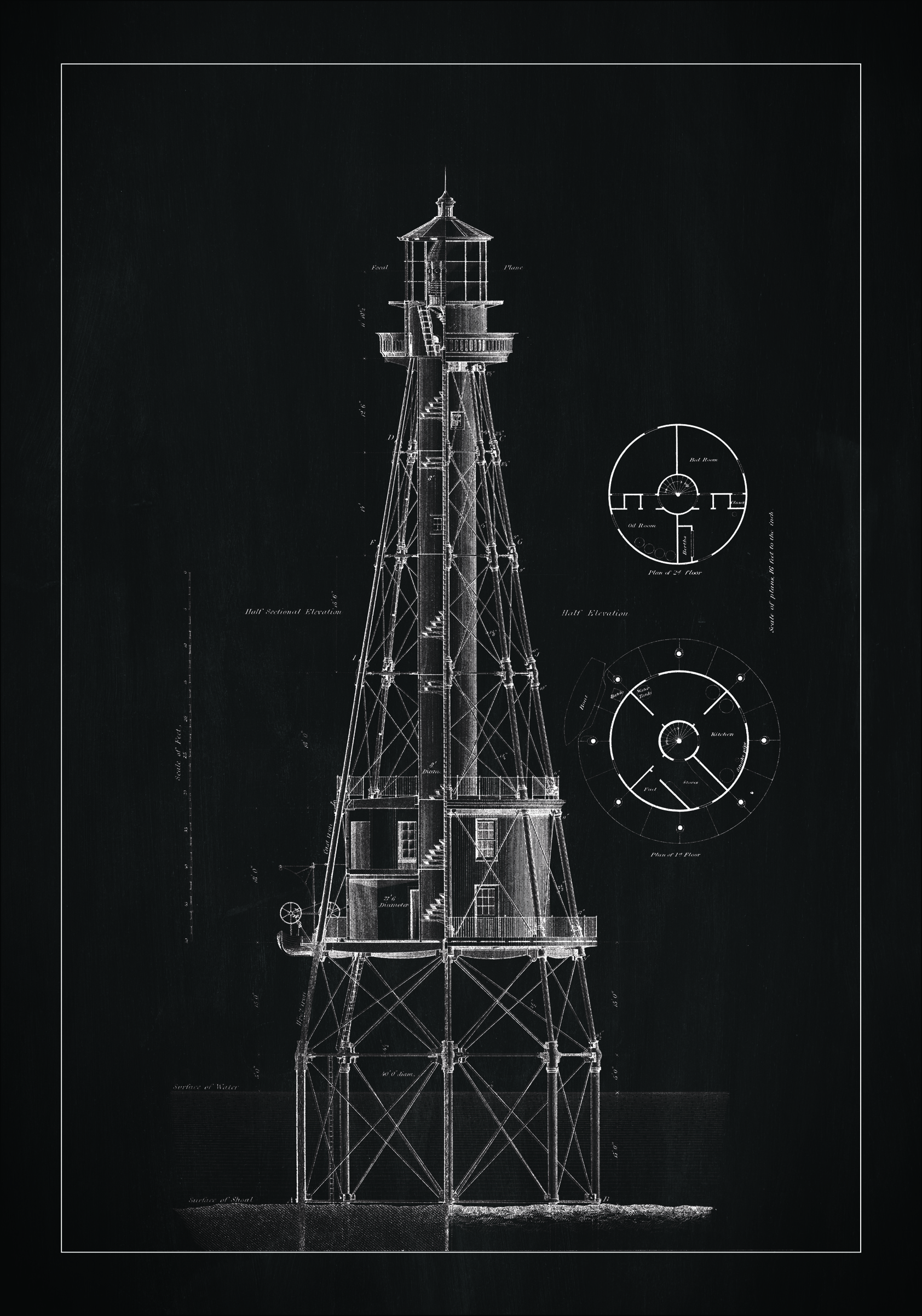 Ak máte záľubu v dekoratívnych prvkoch, ktoré prinášajú históriu, tu máme pre vás perfektný plagát! Plagát evokuje čiernu kriedovú tabuľu s dôkladne vykonaným architektonickým nákresom. Nákres zobrazuje krásny železný maják Ship Shoal Light, ktorý sa týči pri pobreží Louisiany. Maják bol postavený a uvedený do prevádzky v roku 1859 a prežil mnoho hurikánov, avšak časom sa začal nakláňať. Okolo roku 1866 bolo zistené, že strážcovia majáka ochoreli, a po vyšetrovaní sa našla jedovatá farba v nádrži na vodu majáka. V roku 1965 lampa zhasla navždy, ale maják stále stojí ako fascinujúci pamätník.