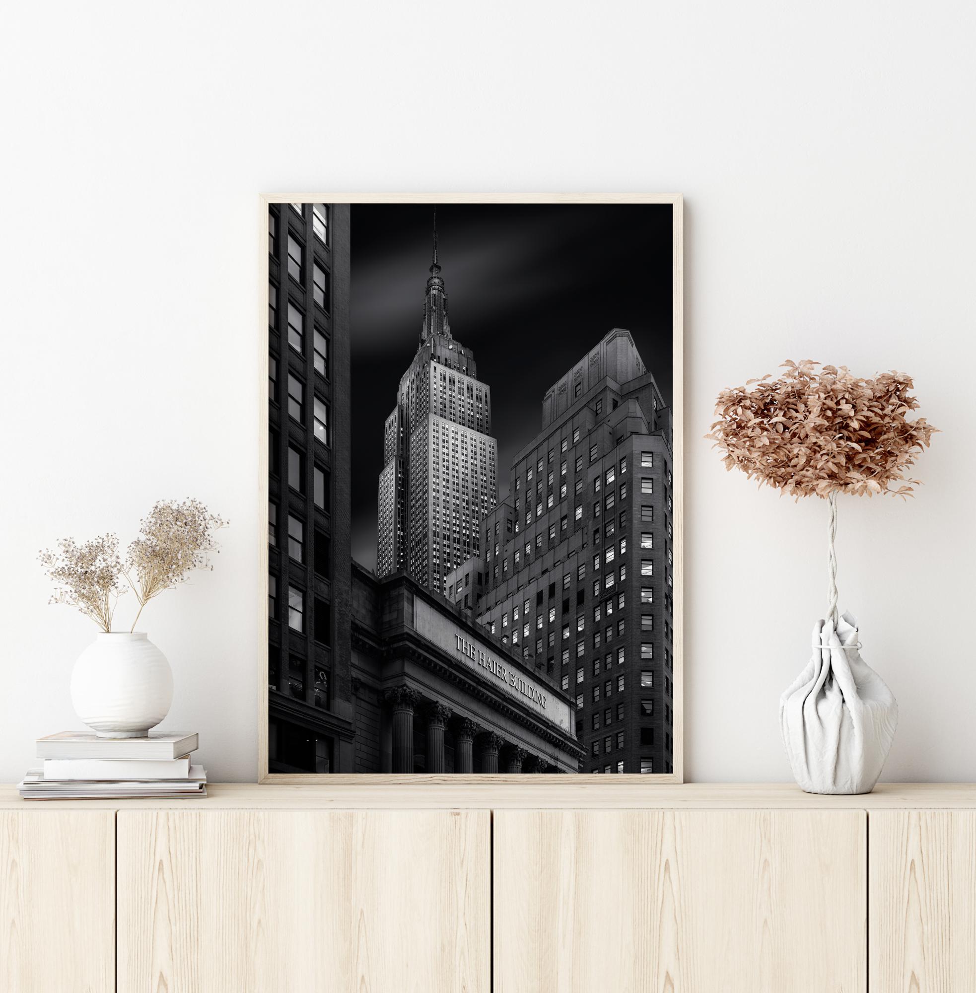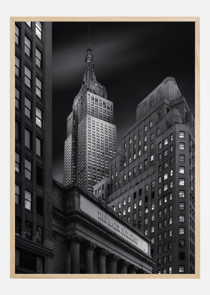 Poster s Haier Building v New Yorku v noci. Jasne zlaté písmená na budove osvetľujú a hlásia "The Haier Building". S budovami proti čiernemu mestskému výhľadu je to veľmi výrazný obraz. Táto dramatická čiernobiela postava z centra New Yorku je perfektná na bielu stenu.