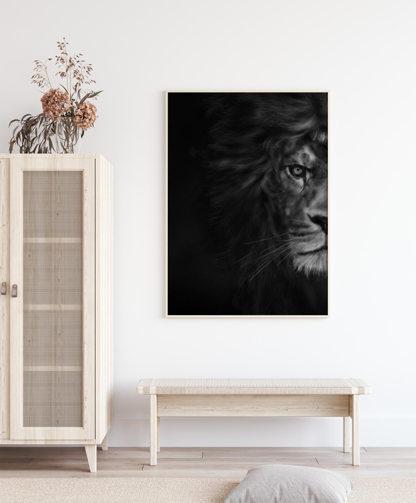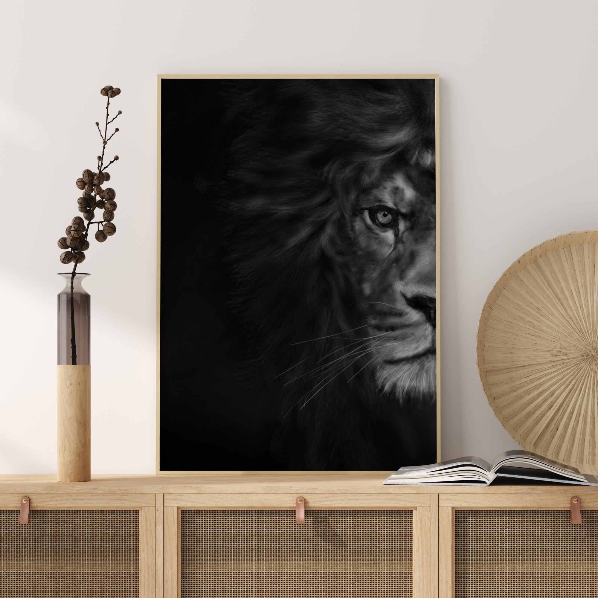 Pôsobivý čiernobiely plagát s divokým levom, ktorý sa pozerá priamo do kamery. Umiestnený vpravo od odtlačku, je viditeľná len polovica tváre leva. So svojou krásnou vlnitou hrivou a majestátnym držaním sa určite dá definovať ako kráľ džungle. Prineste si pocit safari do svojho domova.
