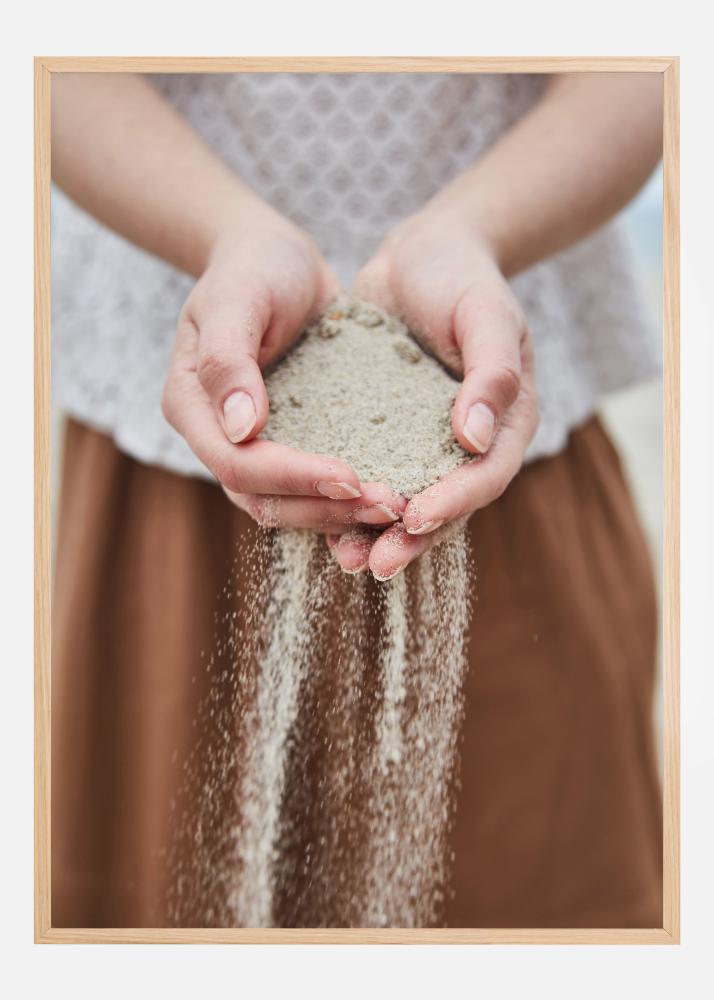 Mäkký a upokojujúci plagát s dievčaťom, ktoré drží piesok v rukách. Jemný piesok jej prepadáva pomedzi prsty. Oblečené v jemne farebných šatách vytvára veľmi upokojujúci obraz. Pokojná a relaxačná fotka, ktorá by dokonale zapadla na béžovú stenu v niektorej z izieb vo vašom dome.