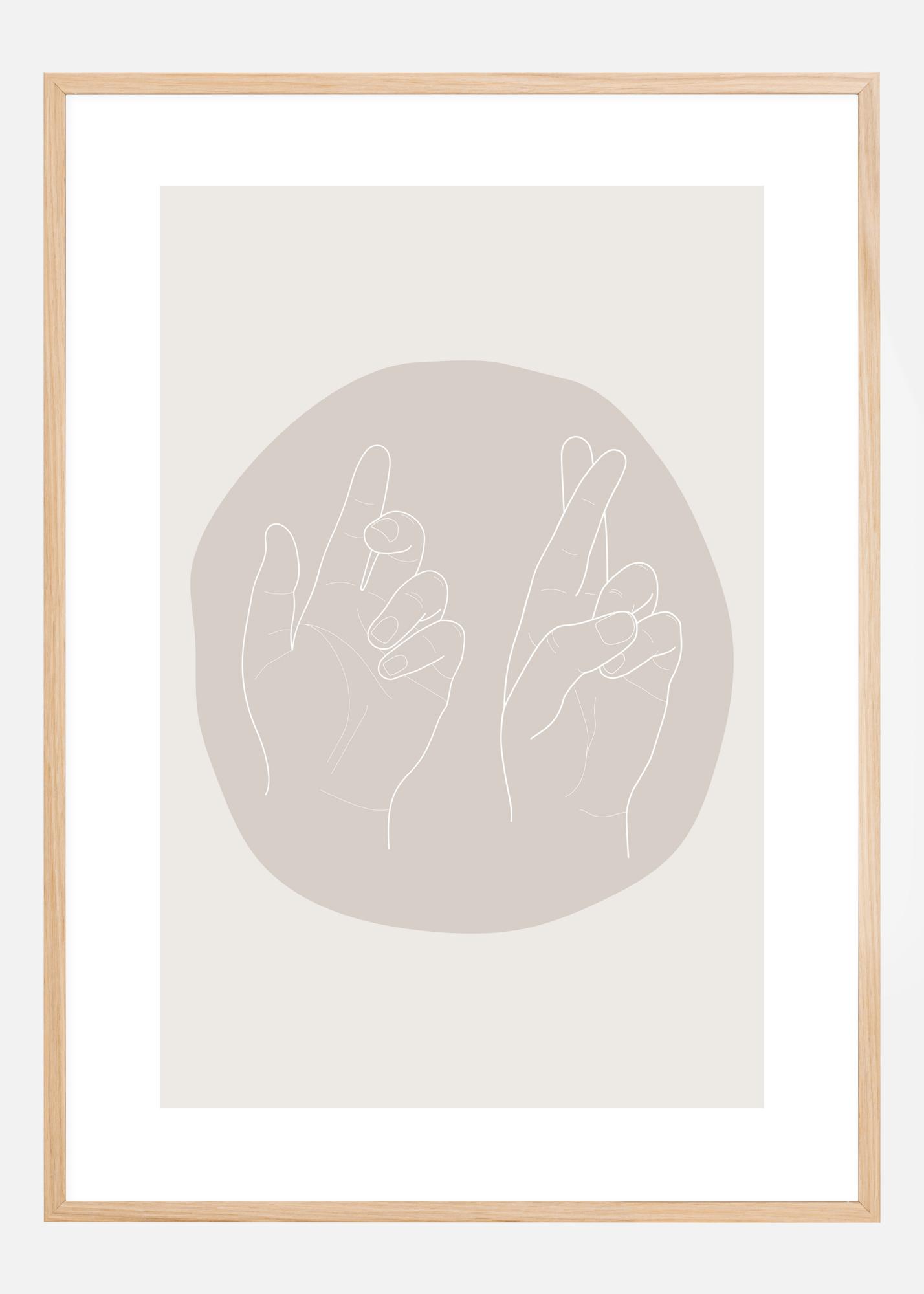 Jednoduchý plagát dvoch ľavých rúk voči okrúhlemu béžovému tvaru. Kruh je umiestnený na telovom pozadí s oboma rukami ukazujúcimi na horný okraj plagátu. Ruky sú uvoľnené a vytvárajú pokojné prostredie vo vašom domove. Perfektný obrázok pre vašu pracovňu.